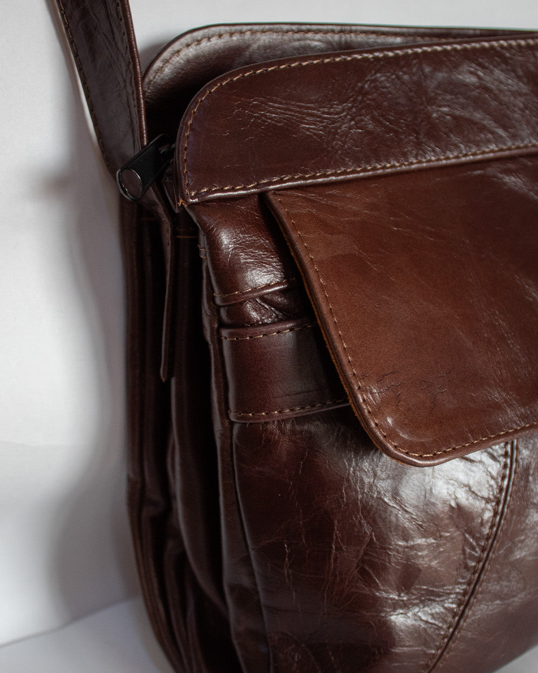 Women's handbag made of genuine leather. This bag features a spacious design with multiple interior compartments. It includes a zippered pocket under the front flap, a main compartment with three sections and one zippered pocket, and another zippered pocket on the back. Ideal for carrying all your daily essentials.
