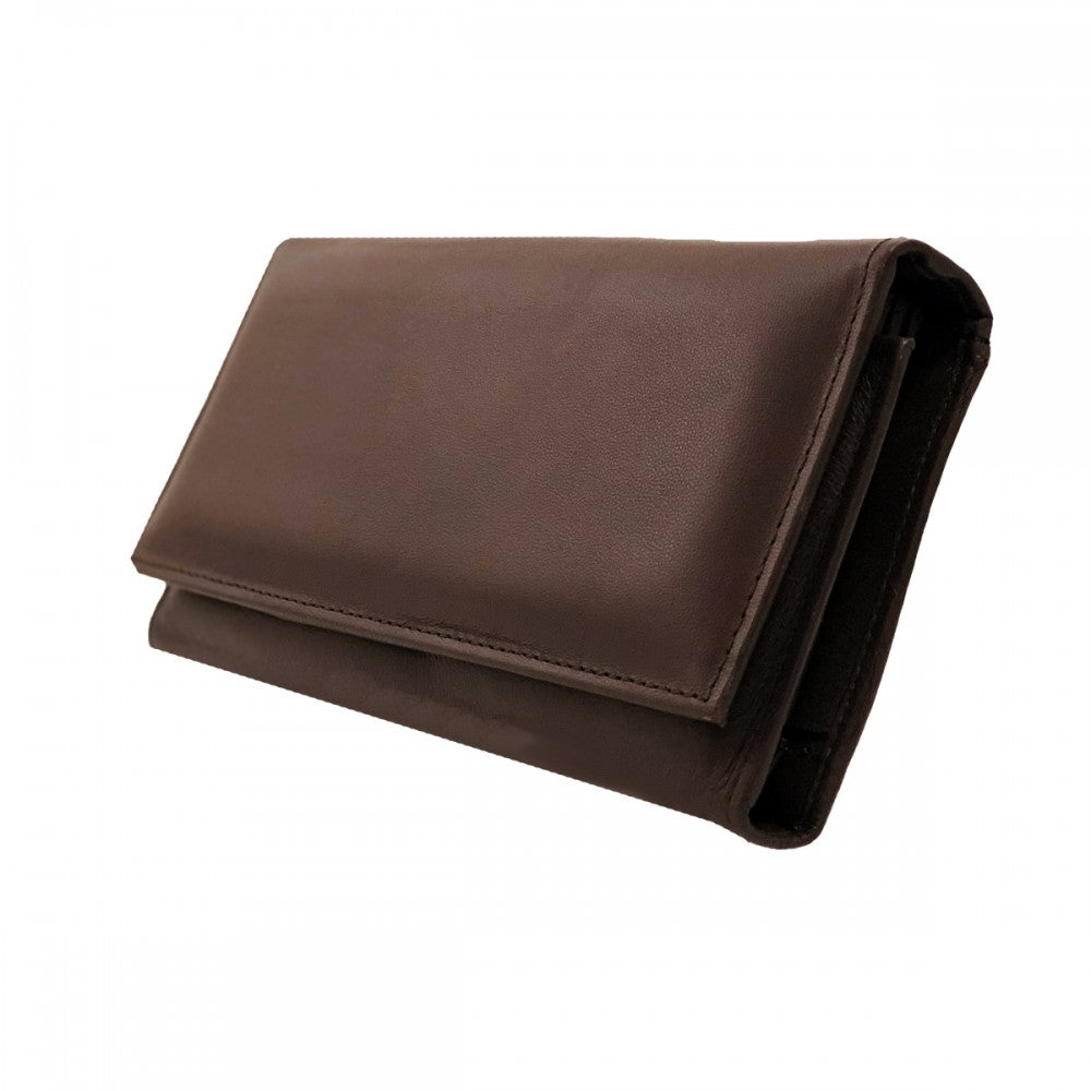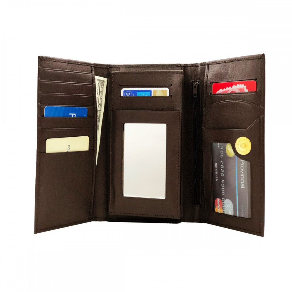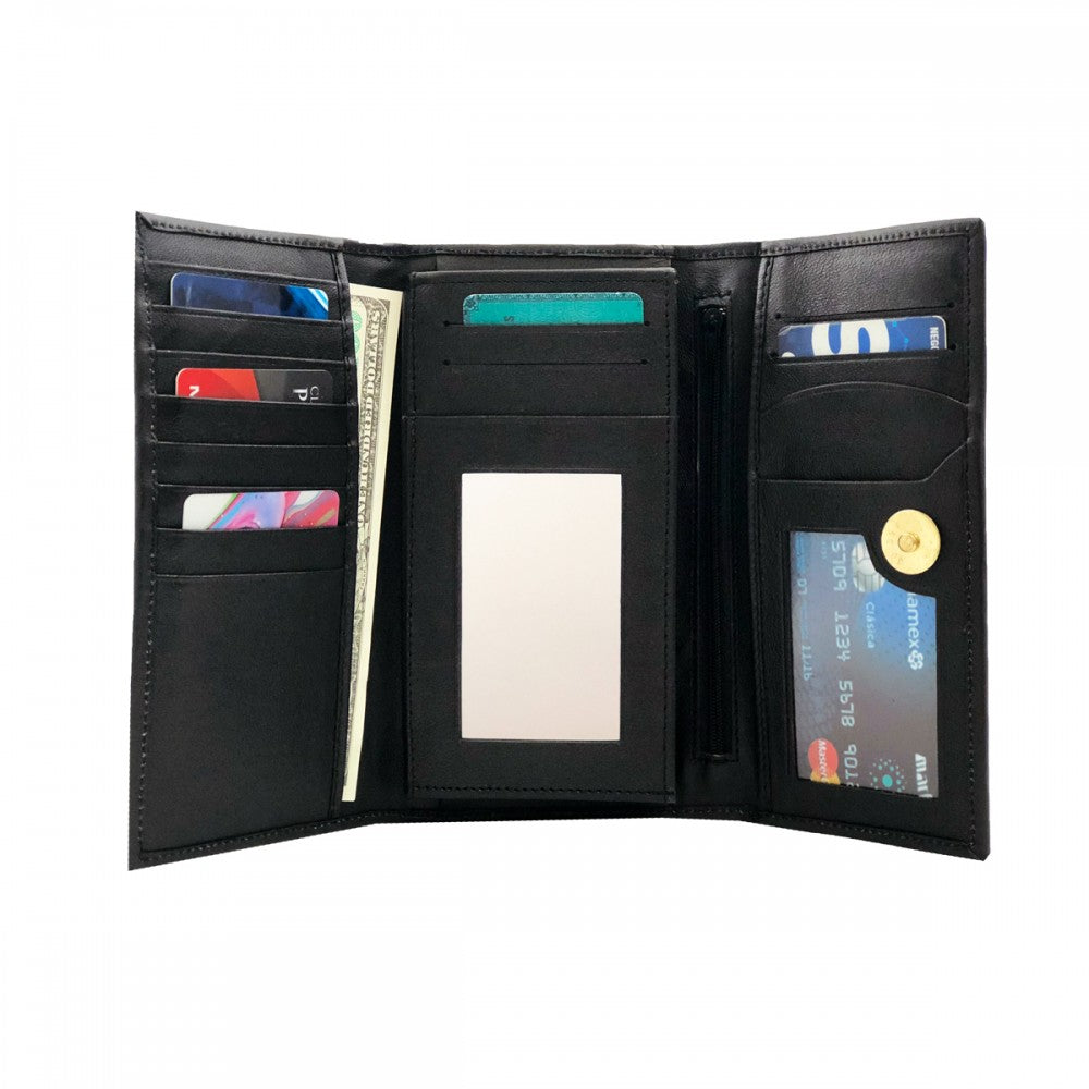 Monedero completo fabricado en cuero de alta calidad y suavidad. Cartera de piel para dama, presenta un diseño tríptico para acomodar tarjetas, dinero en efectivo y una bolsa con cierre para monedas. Ideal para el uso diario.