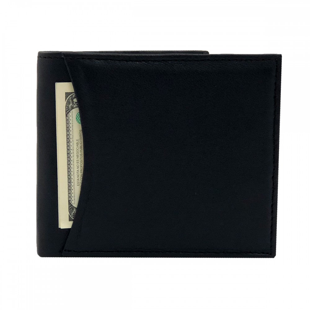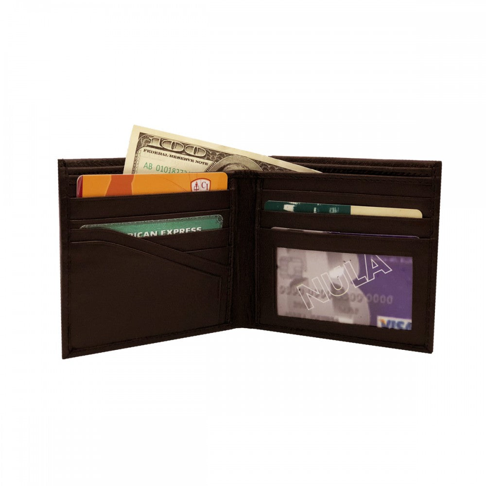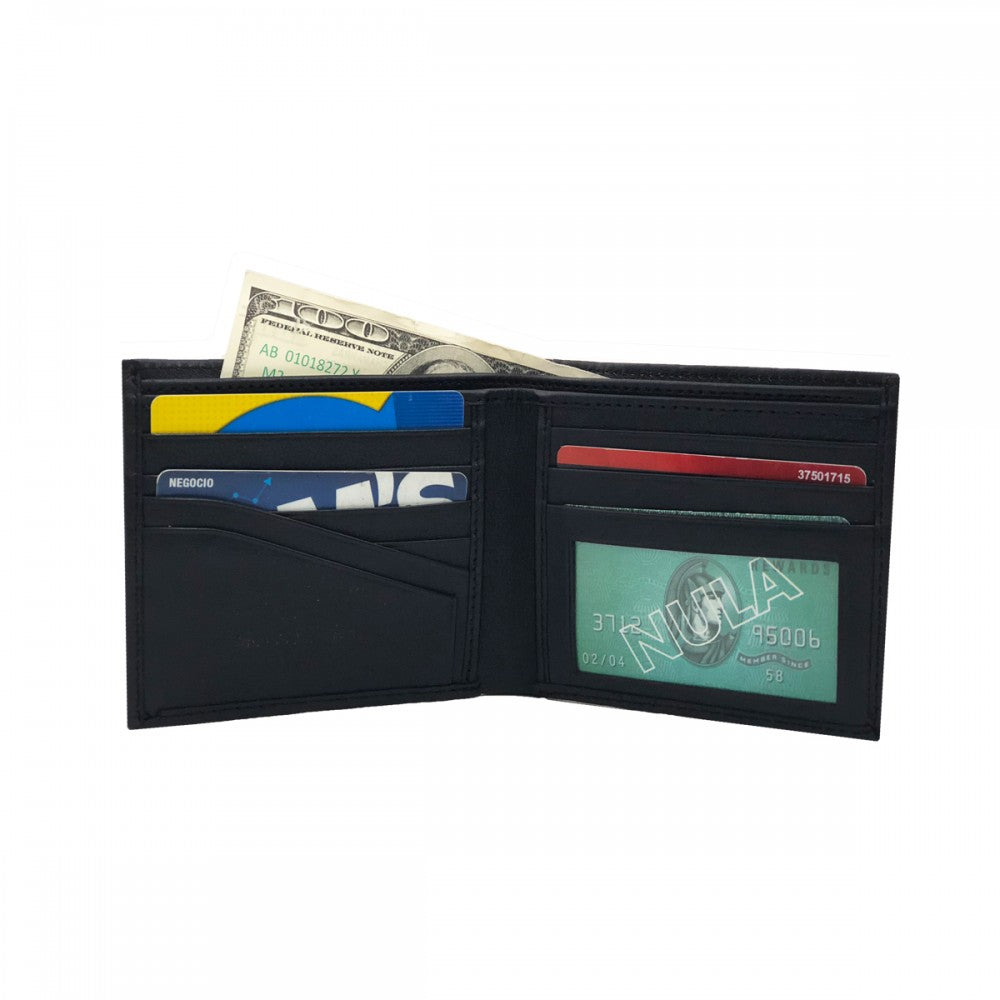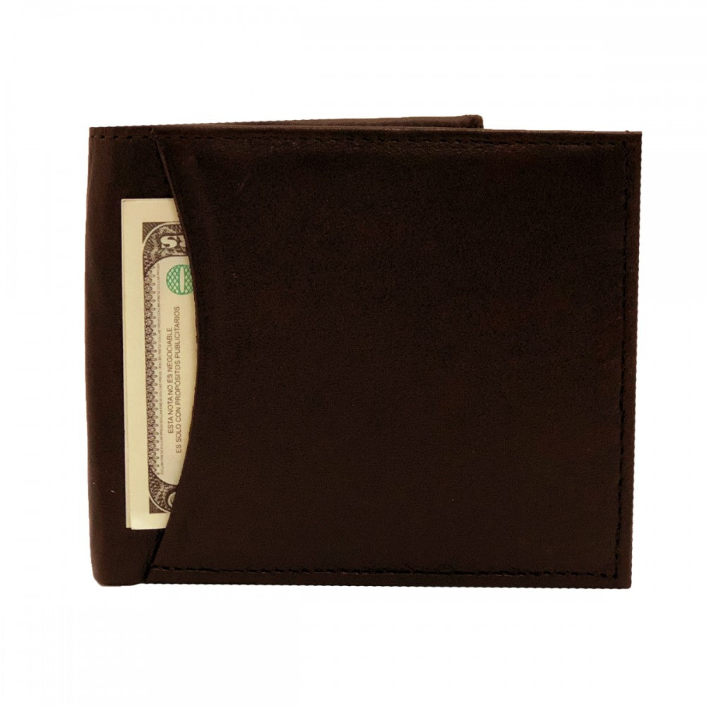 Cartera de caballero con un excelente diseño y capacidad. Fabricada en cuero liso suave tiene dos compartimentos para billetes, ocho ranuras para tarjetas y una ventana para identificación.