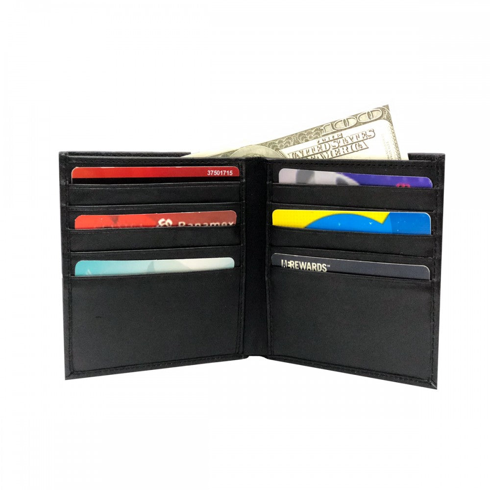 Billetera de forma cuadricular fabricada en piel de borrego de diseño elegante y con gran capacidad para tarjetas e identificaciones.
