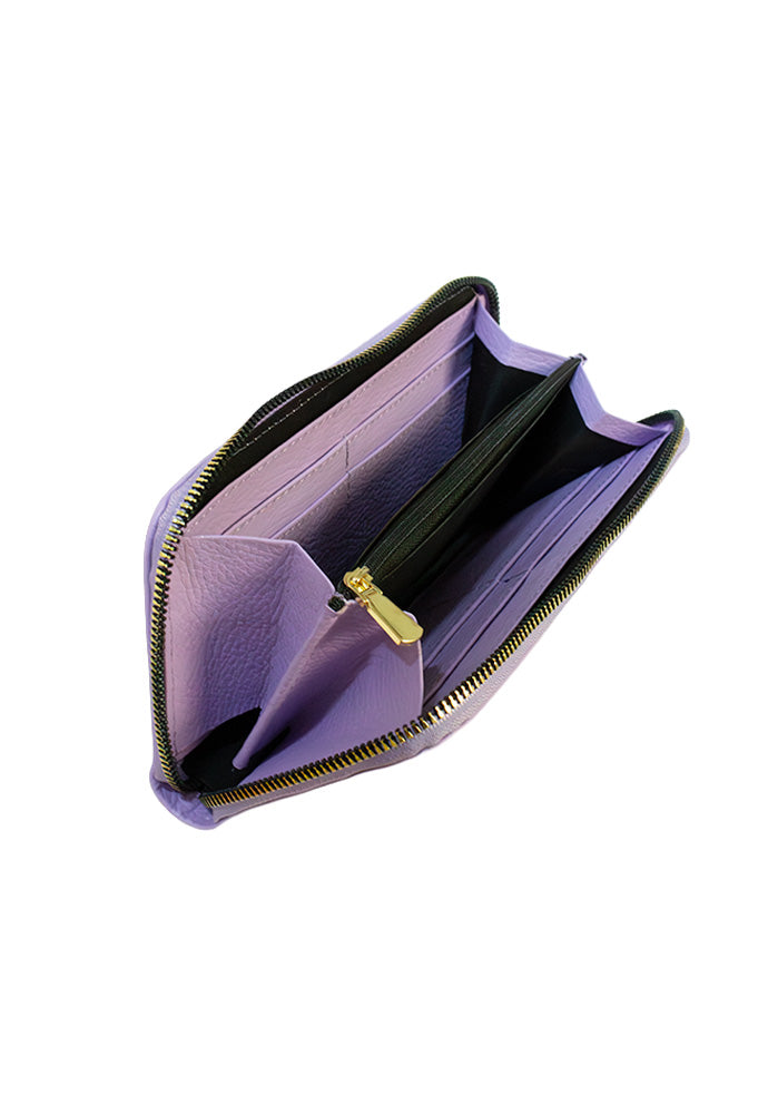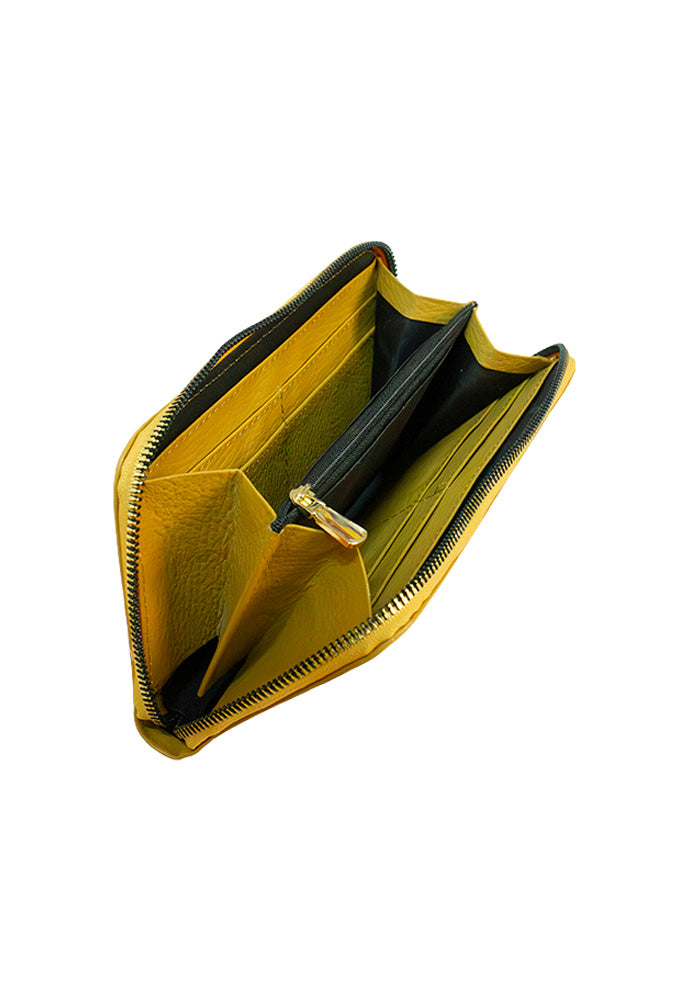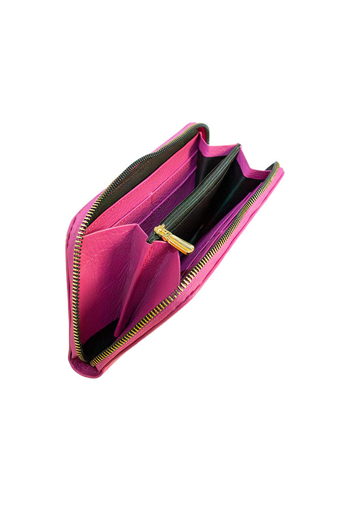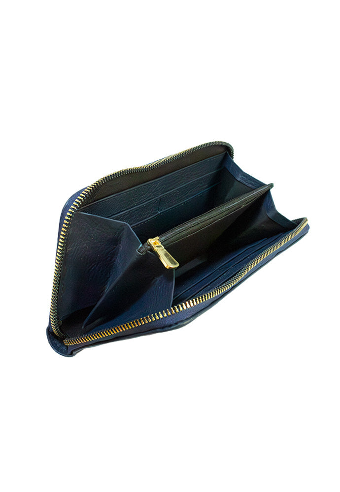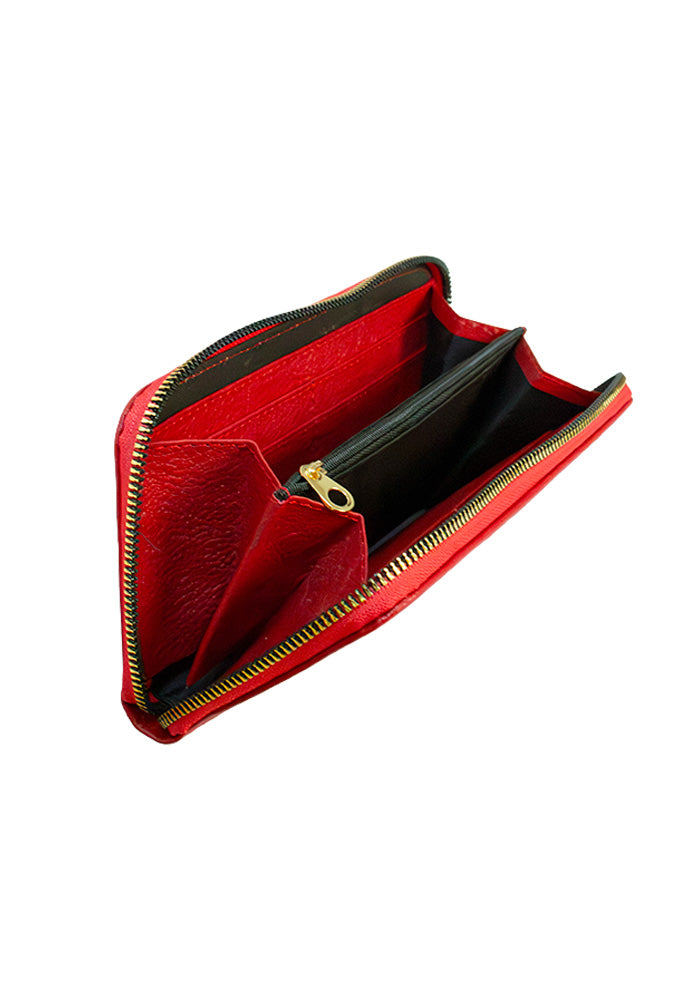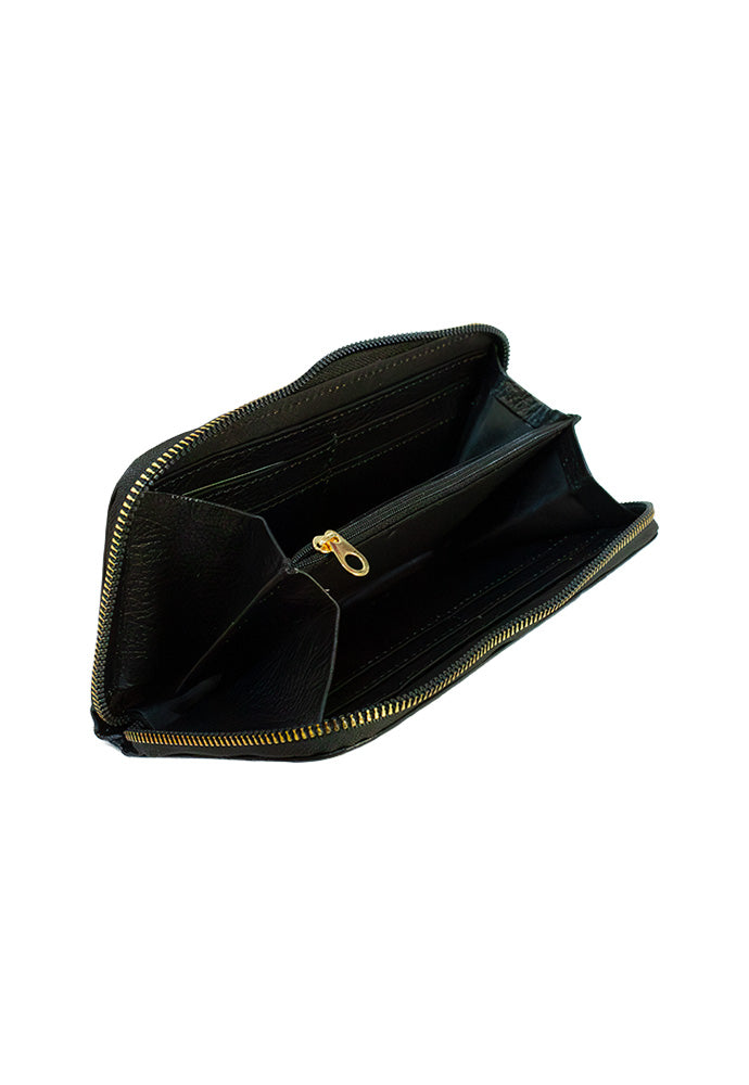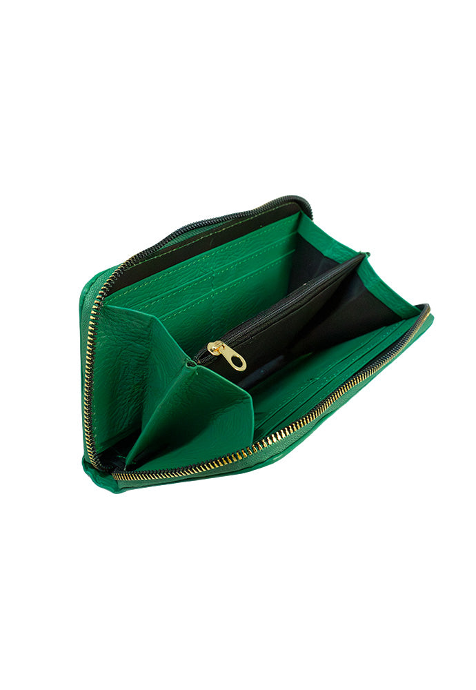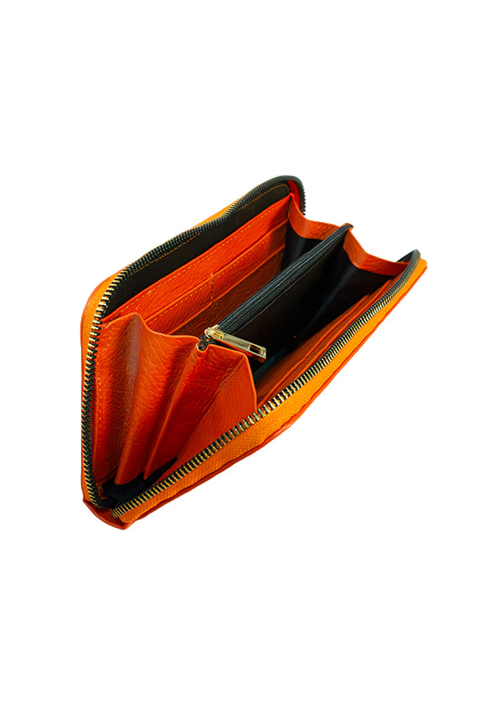 Monedero completo fabricado en cuero de alta calidad y suavidad. Cartera para dama hecha en piel con terminado floater presenta un diseño tríptico para acomodar tarjetas con 8 espacios en total, dinero en efectivo y monedas. Ideal para el uso diario, con cierres de metal en color dorado.