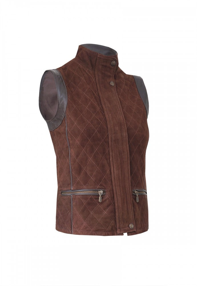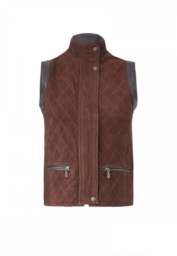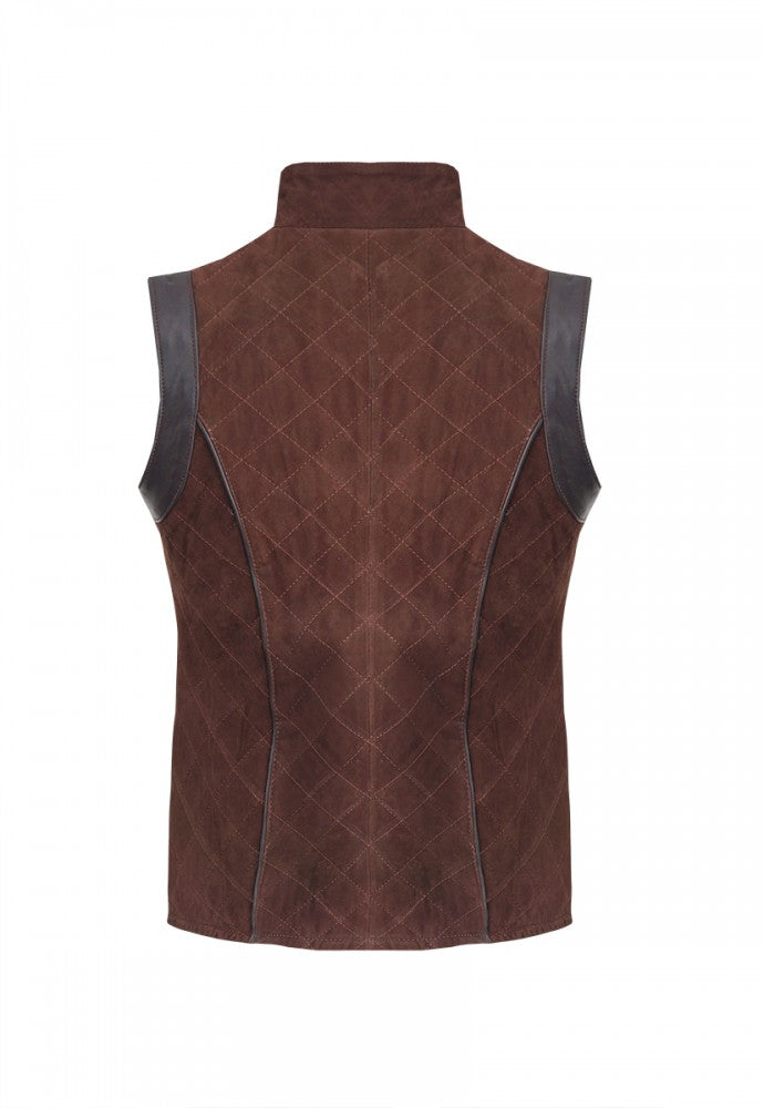 Quilted vest made of genuine sheepskin and calfskin, satín-type textile lining, two exterior pockets with closure and snap button, fastening with metal closure, mandarin collar, sizes from XS to XL.