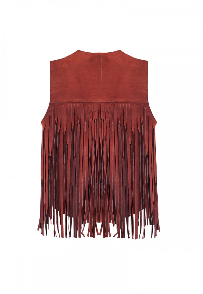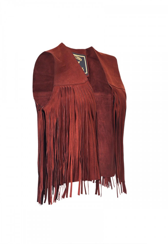 Chaleco de barbas hecho con piel genuina de becerro, sin forro, disponible en color café, tallas desde XS hasta L.