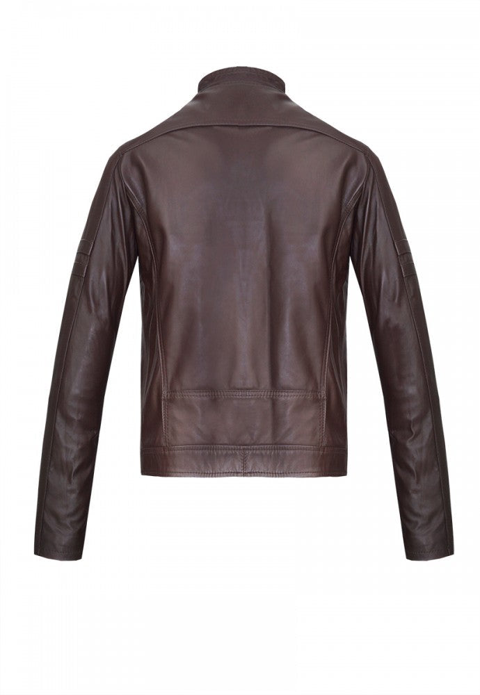 Leather jacket with a slim fit, made with genuine lamb leather, satín-type textile lining, old brass-colored metal closure with a price clasp on the mandarin collar, four outer bags and one inner bag, available in brown and black, sizes from XS to XL.
