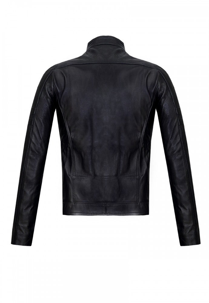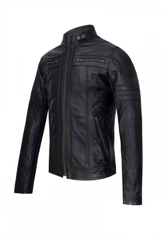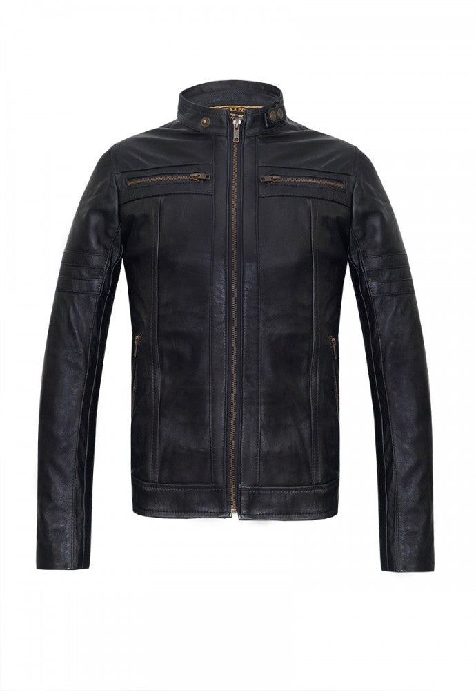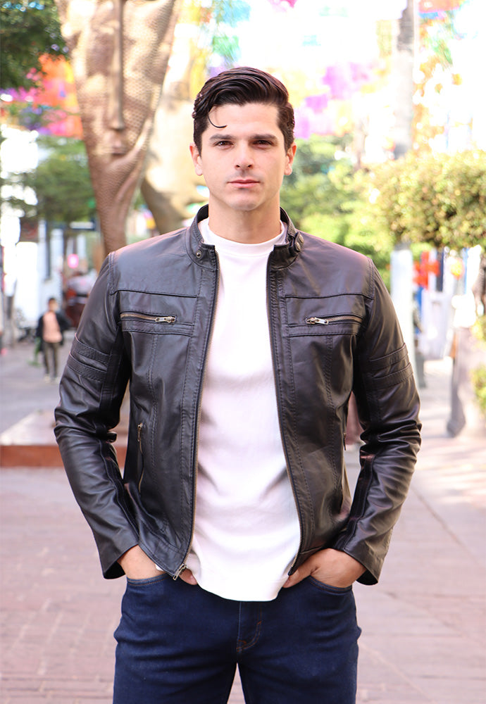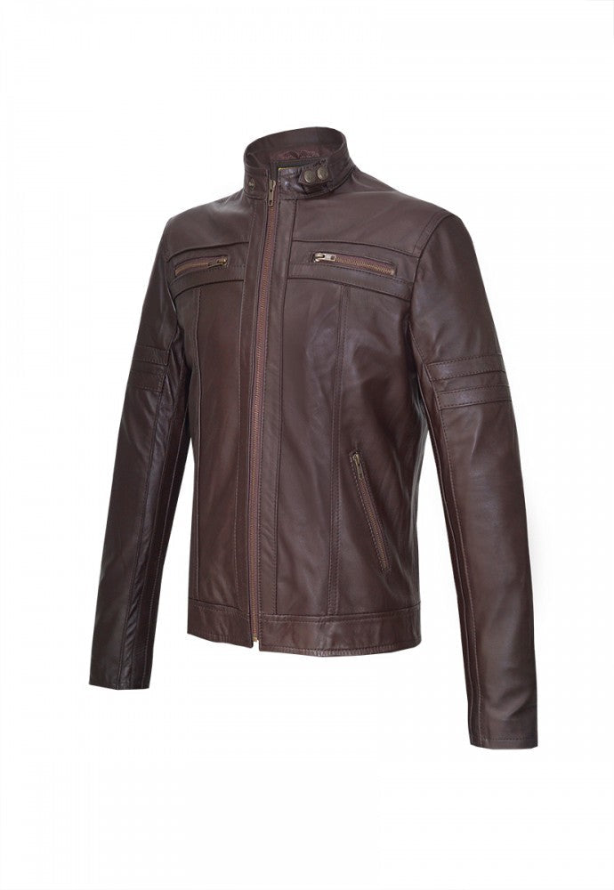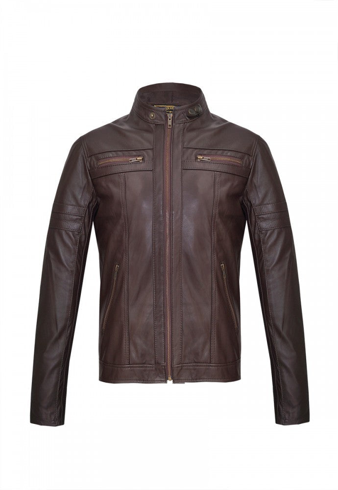 Chamarra de piel con corte Slim, hecha con cuero genuino de borrego, forro textil tipo satín, cierre metálico color latón viejo con broche de presión en el cuello tipo Mao, cuatro bolsas exteriores y una bolsa interior, disponible en color café y negro, tallas desde XS hasta XL.