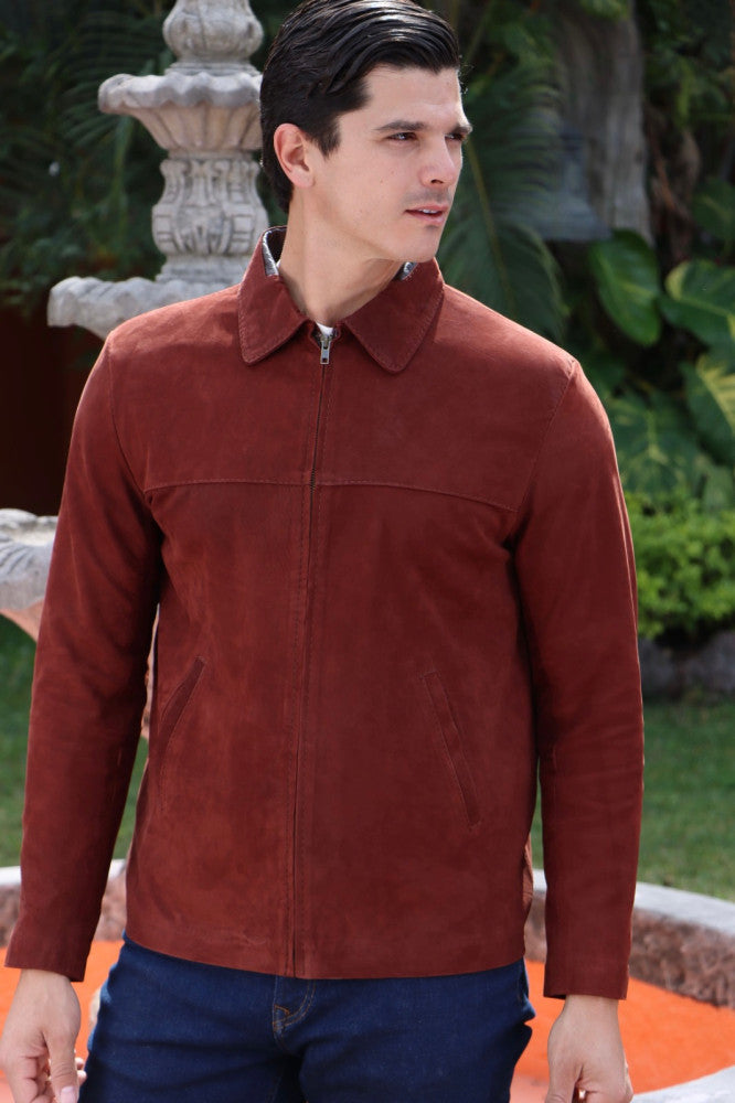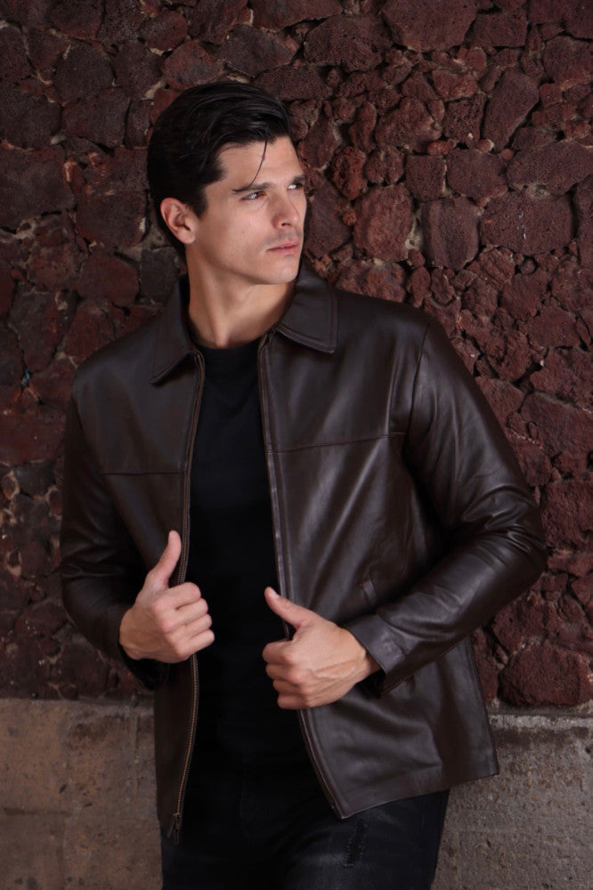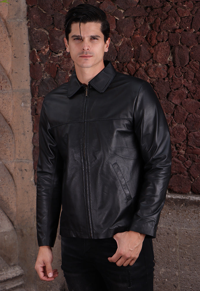 Chamarra de piel para caballero, modelo en cuero genuino de borrego, forro textil tipo satín, cierre metálico color latón, dos bolsas exteriores y una bolsa interior, disponible en color café, negro y café NBK , tallas desde XS hasta XXL.