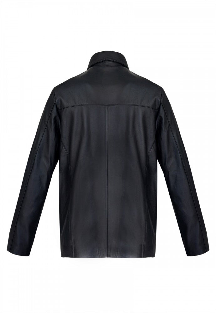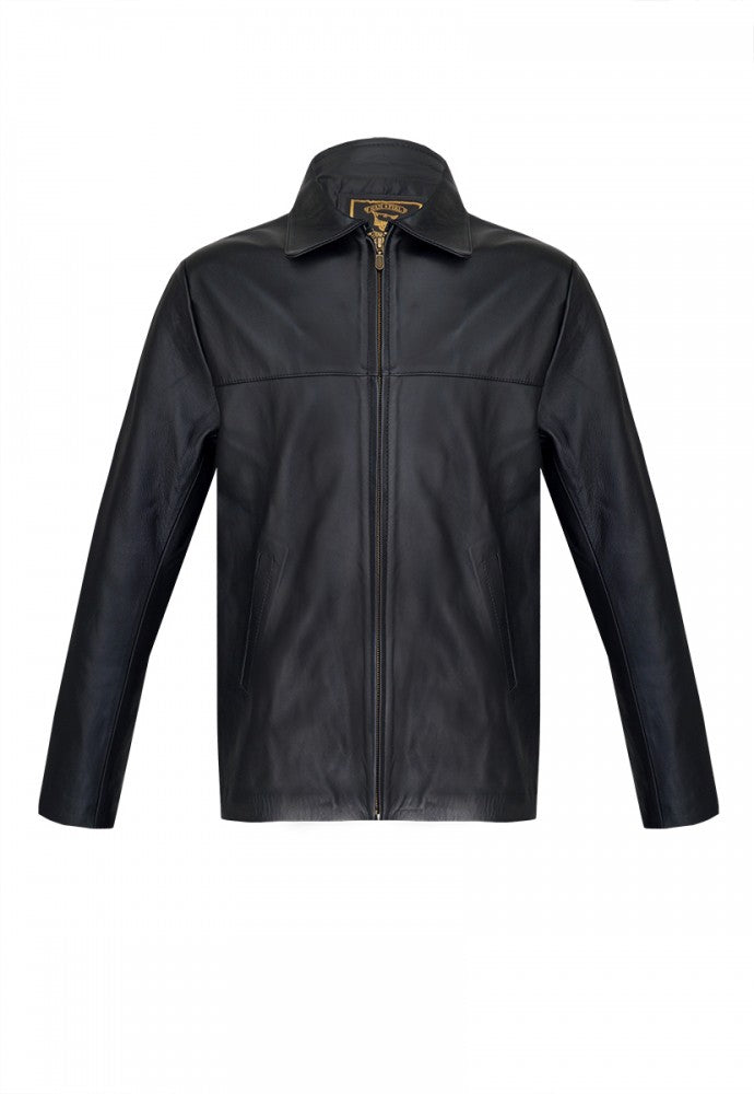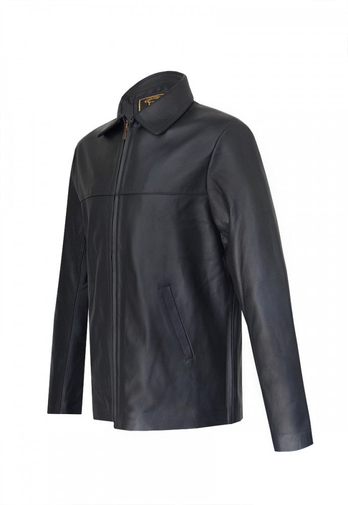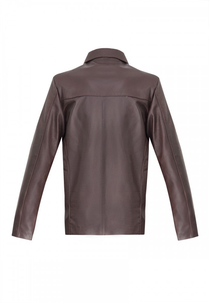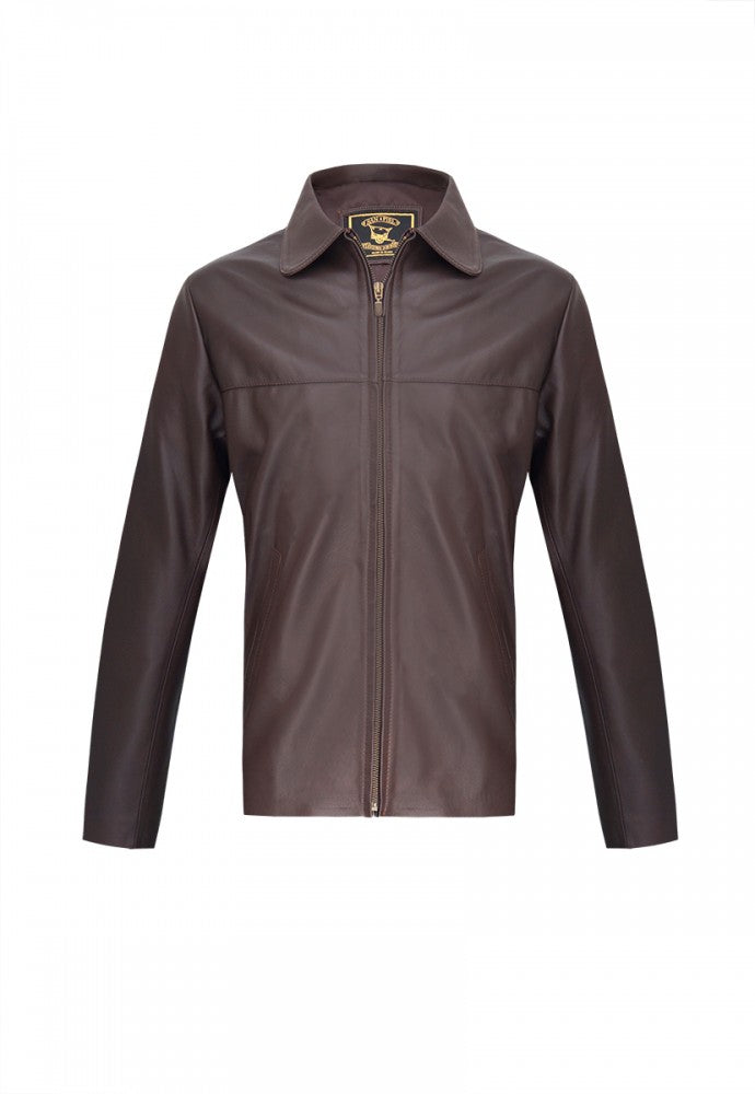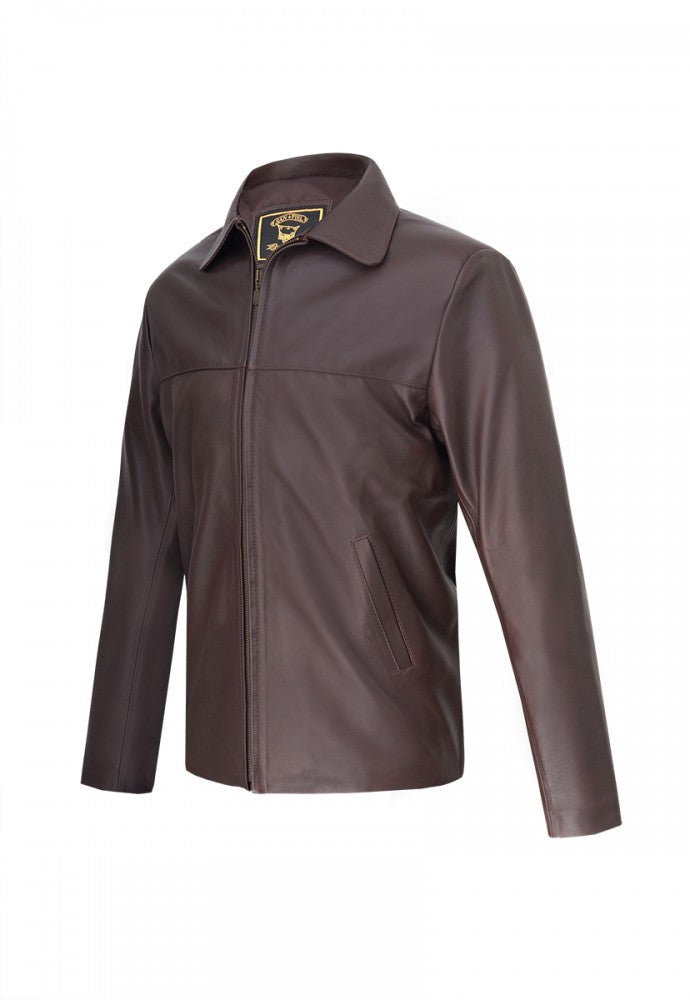 Men's leather jacket, genuine sheepskin leather model, satín-like textile lining, brass-colored metal closure, two outer bags and one inner bag, available in brown, black and NBK brown, sizes from XS to XXL.