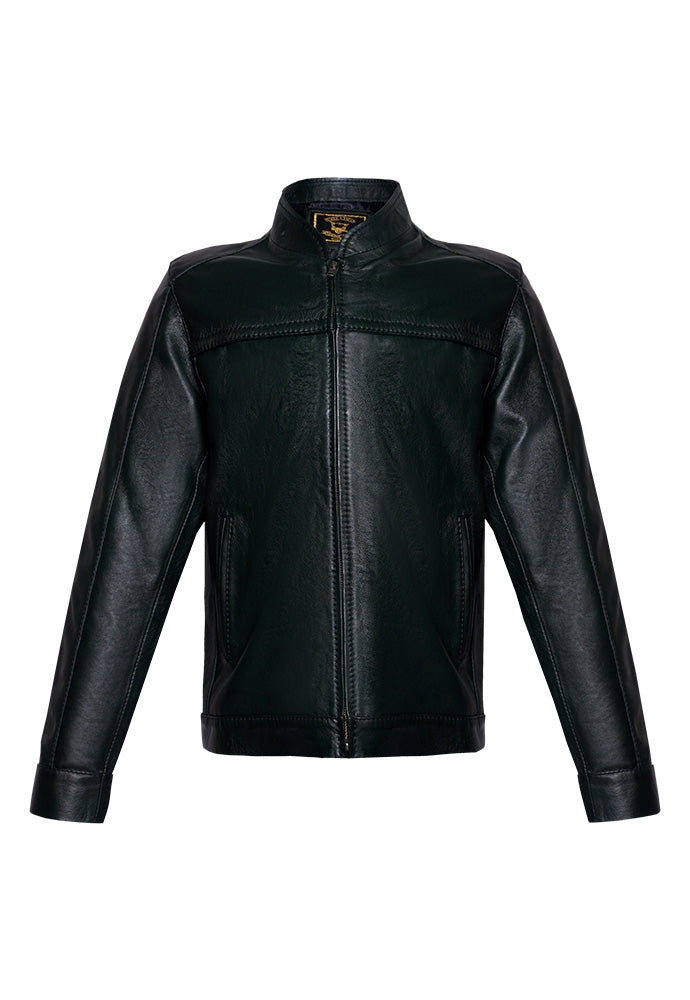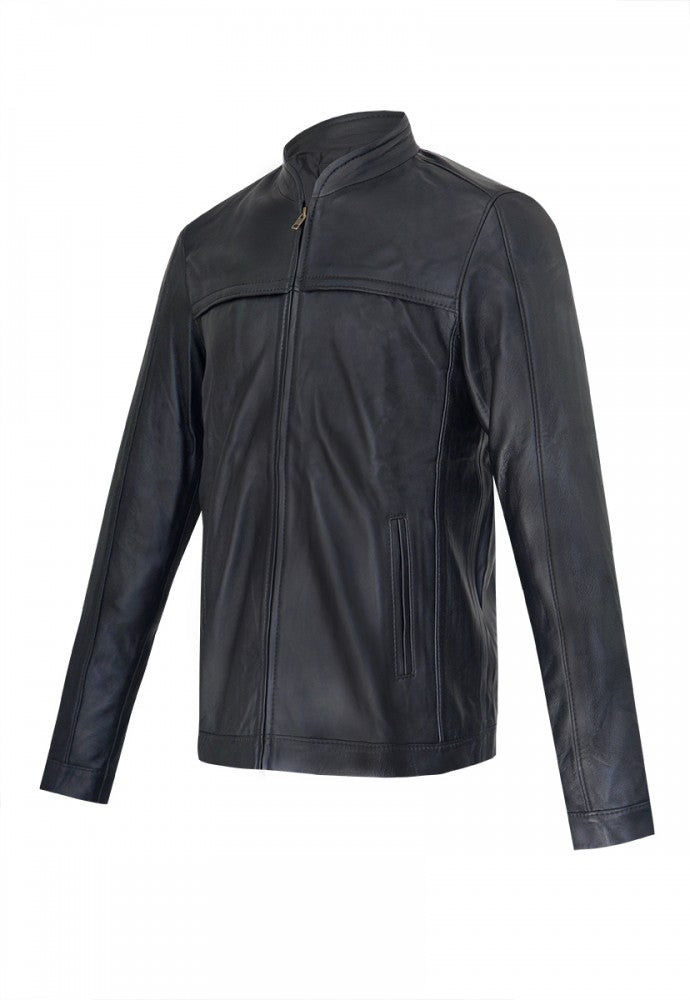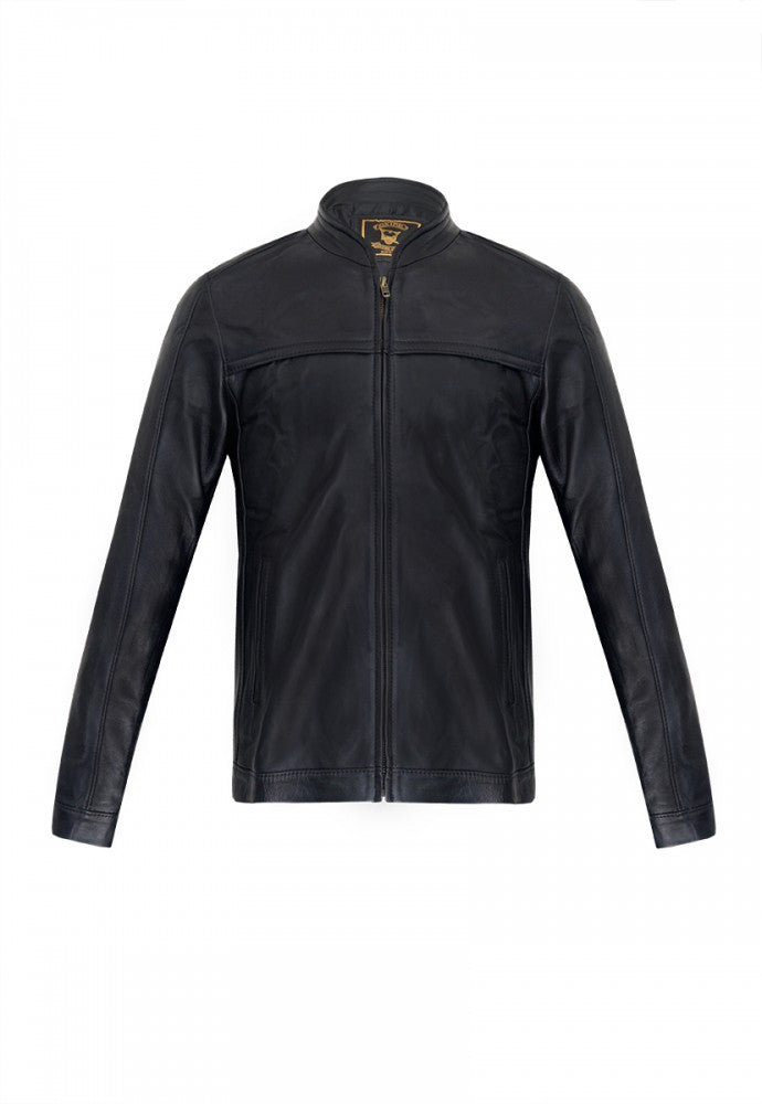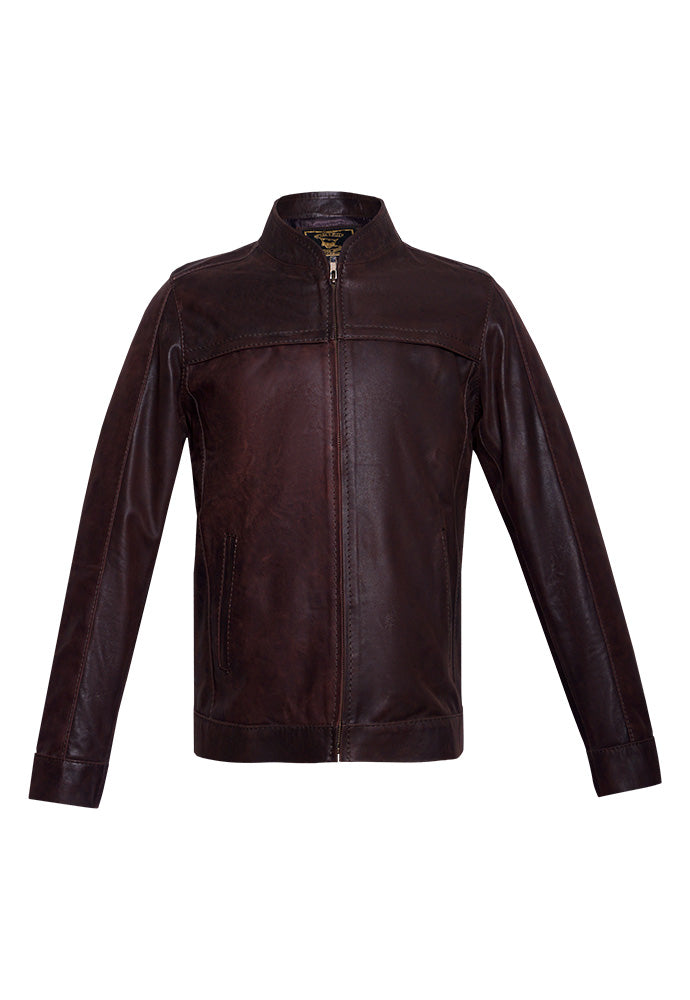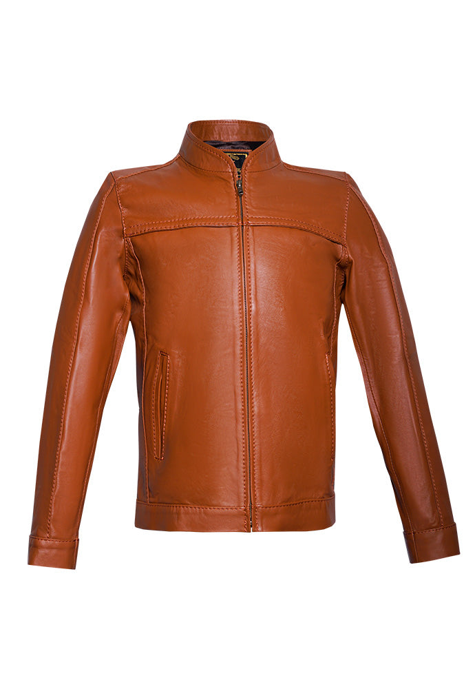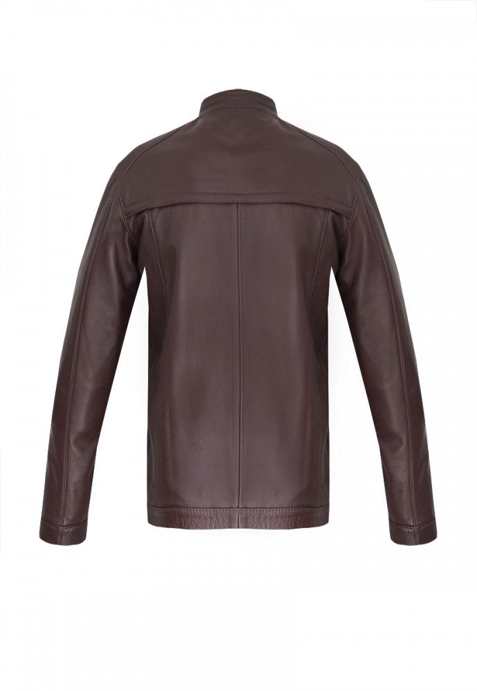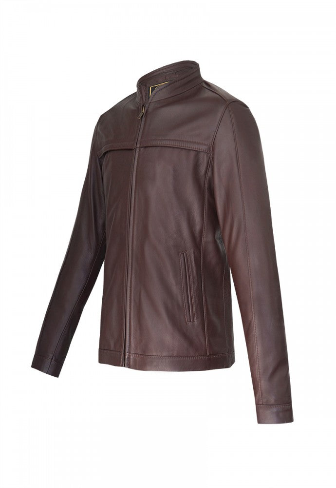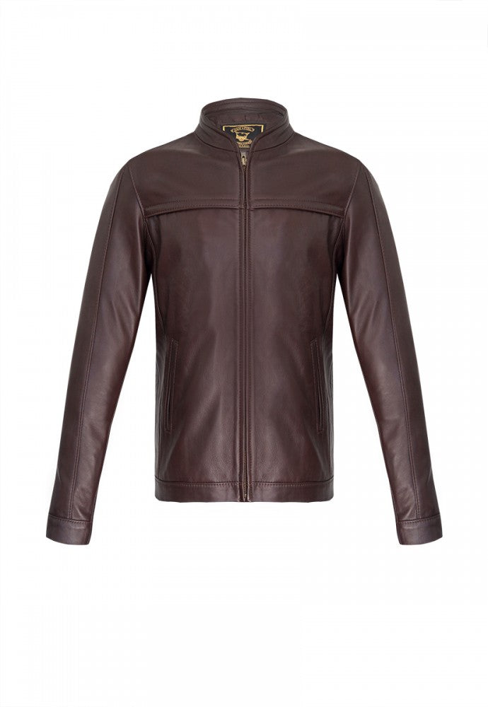 Men's leather jacket, genuine lamb leather, satín-type textile lining, brass-colored metal closure, two exterior bags and one interior bag, available in brown and black, sizes from XS to XXL.