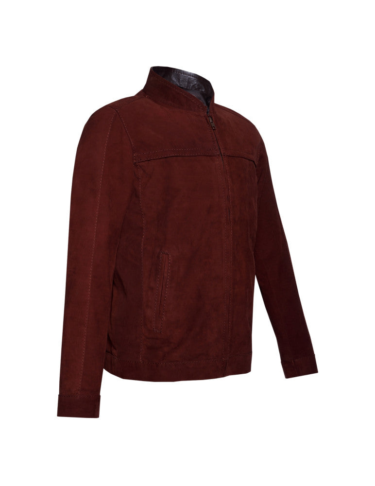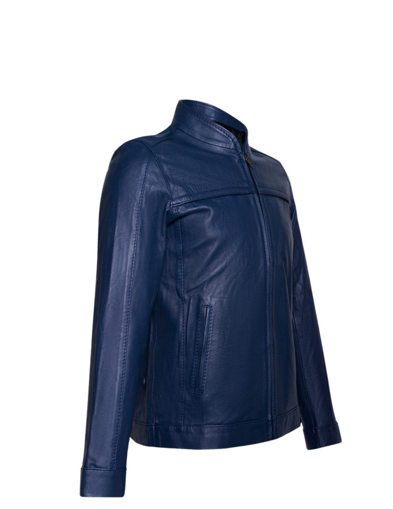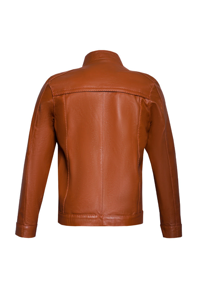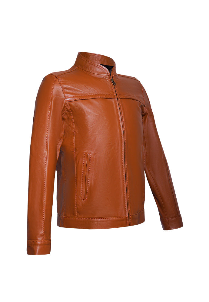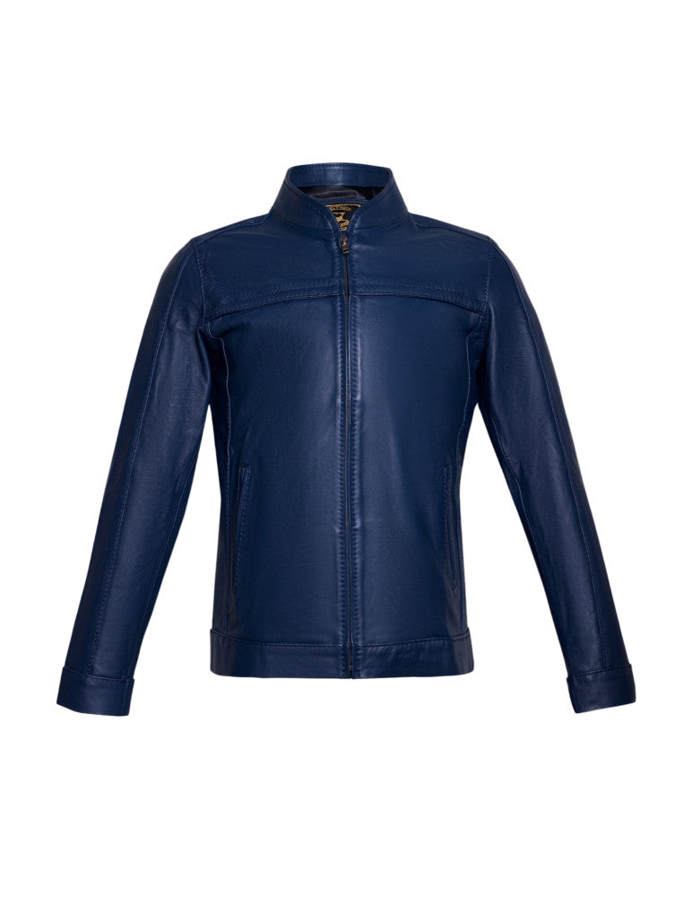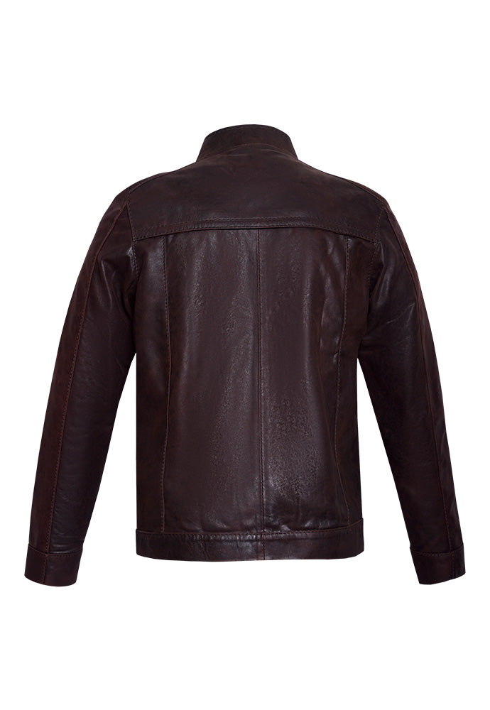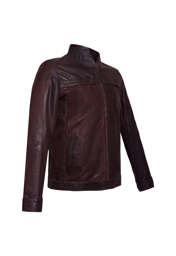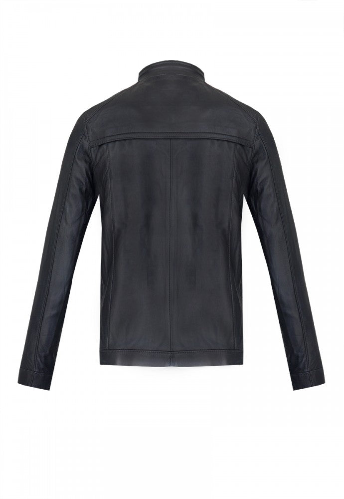 Men's leather jacket, genuine lamb leather, satín-type textile lining, brass-colored metal closure, two exterior bags and one interior bag, available in brown and black, sizes from XS to XXL.