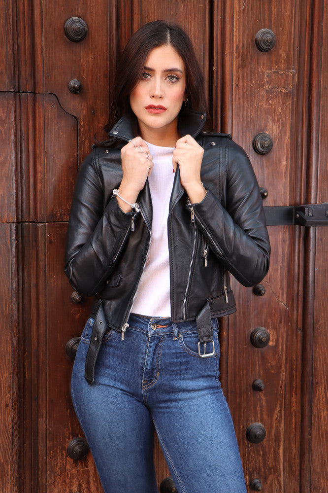 Short leather jacket, rock style made of genuine lamb leather, satín-type textile lining. It has three exterior zipper pockets, one with a metal snap, collar with metal snaps, fastens with a silver-tone metal zipper. It includes closures in the sleeve area and a belt with buckle, available in black and blue, sizes from XS to XL.