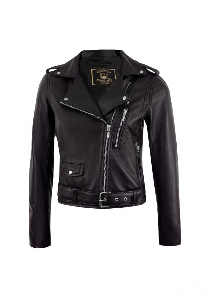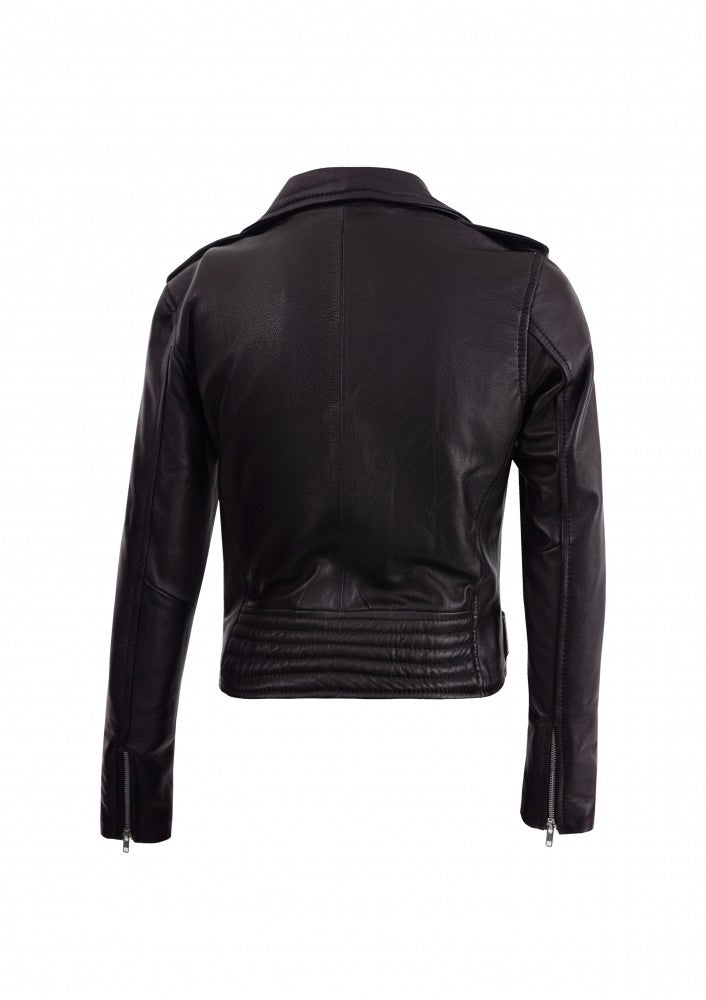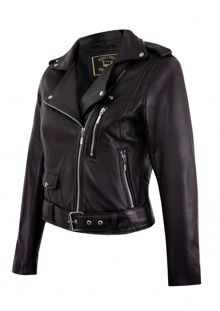 Chamarra de piel corta, estilo rockero fabricada en cuero genuino de borrego, forro textil tipo satín. Cuenta con tres bolsas exteriores en cierre, una con broche de presión metálico, cuello con broches de presión metálicos, abrocha con cierre metálico en tono plata. Incluye cierres en la zona de las mangas y un cinturón con hebilla, disponible en color negro y azul, tallas desde la XS a la XL.