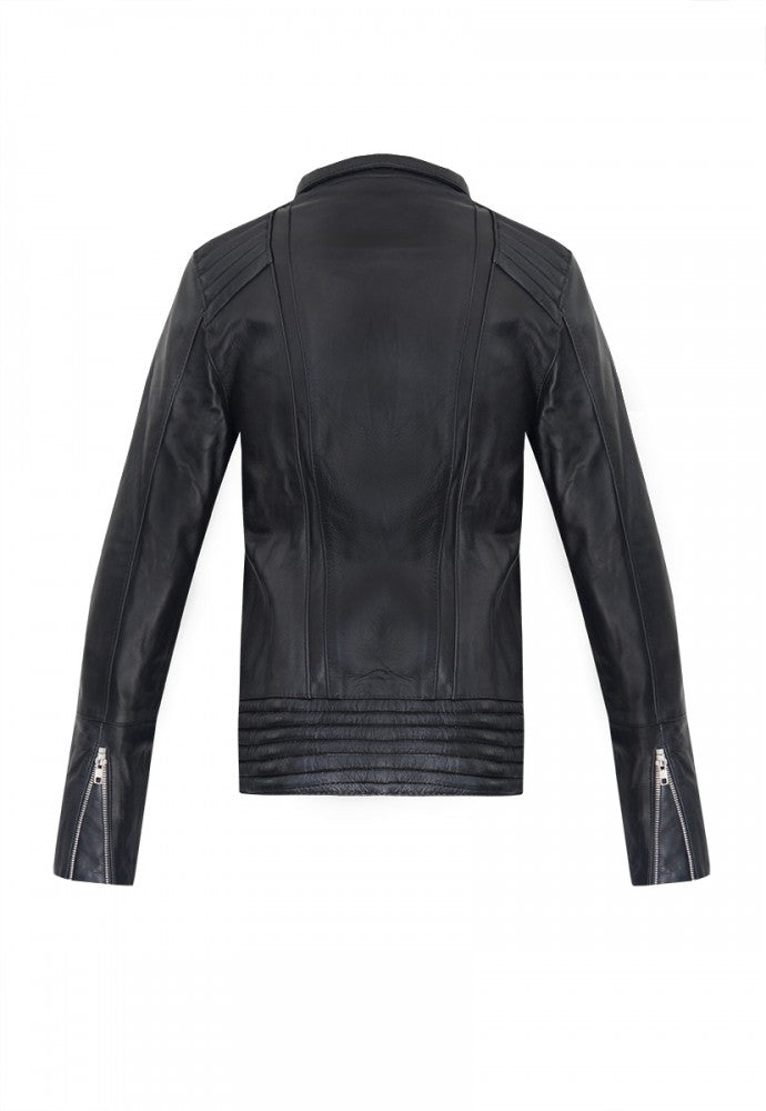 Chamarra larga hecha en piel genuina de borrego, con forro textil tipo satín, cierre metálico en tono plata. Cuenta con dos bolsas exteriores en cierre y una bolsa al interior. Cuenta con detalles con cierres en la parte de las mangas y cuello estilo Mao con solapa lo que permite cerrar por completo la chamarra si así lo desea. Disponible en color negro y café, tallas desde XS hasta XL.