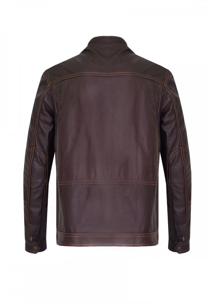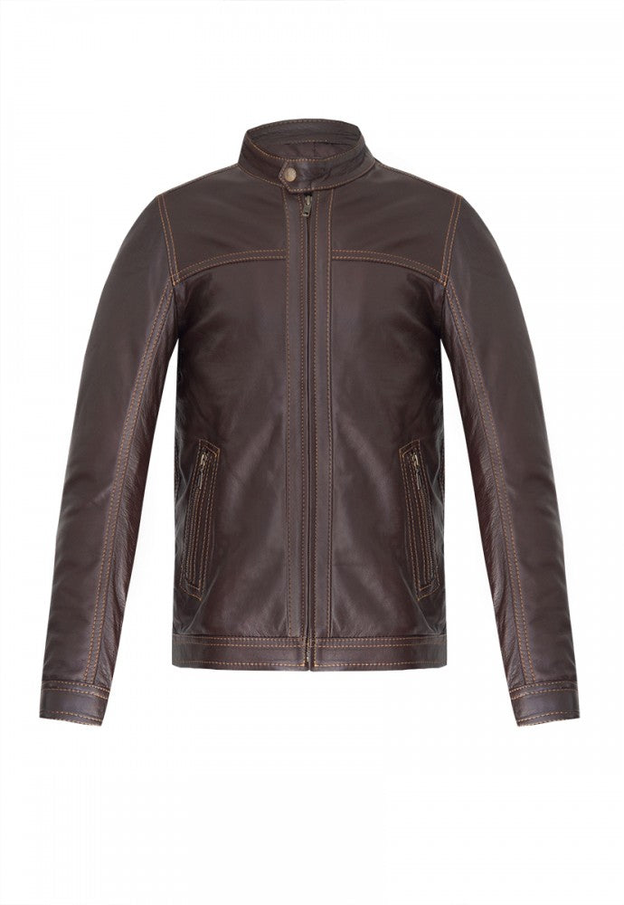 Men's genuine sheepskin leather jacket with satín-type textile lining, old brass-colored metal closure with a mandarin collar clasp, two exterior bags and one interior bag, available in brown and black with gold and black crust stitching, sizes from S to XL.