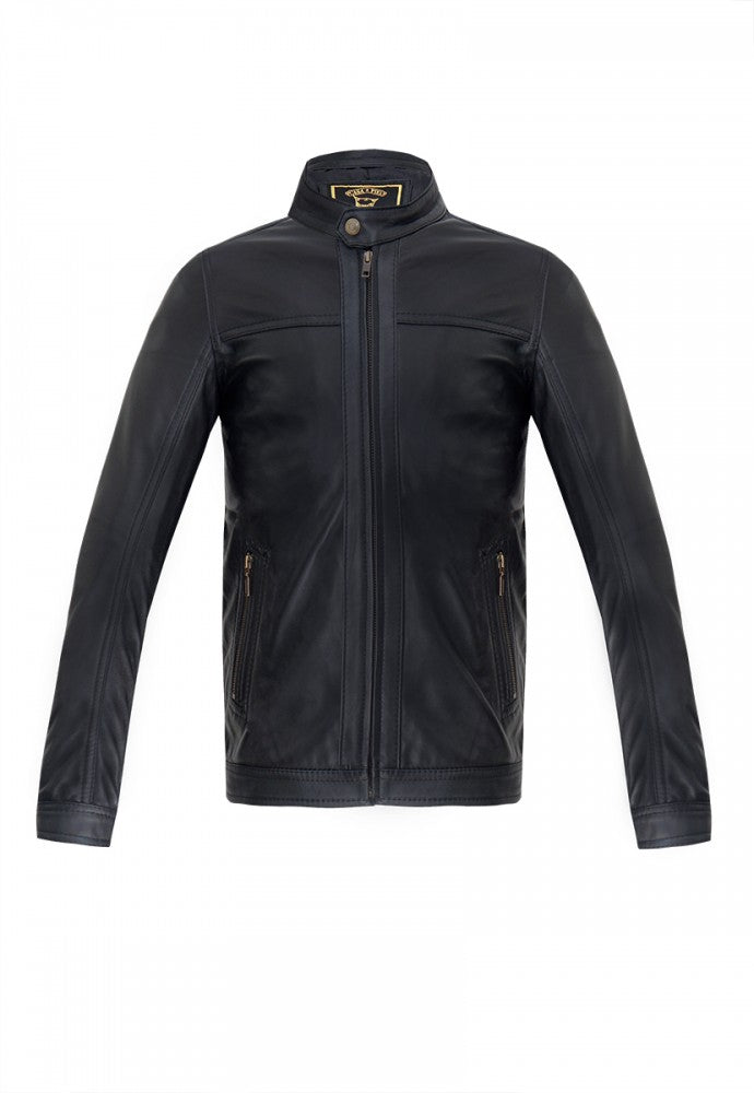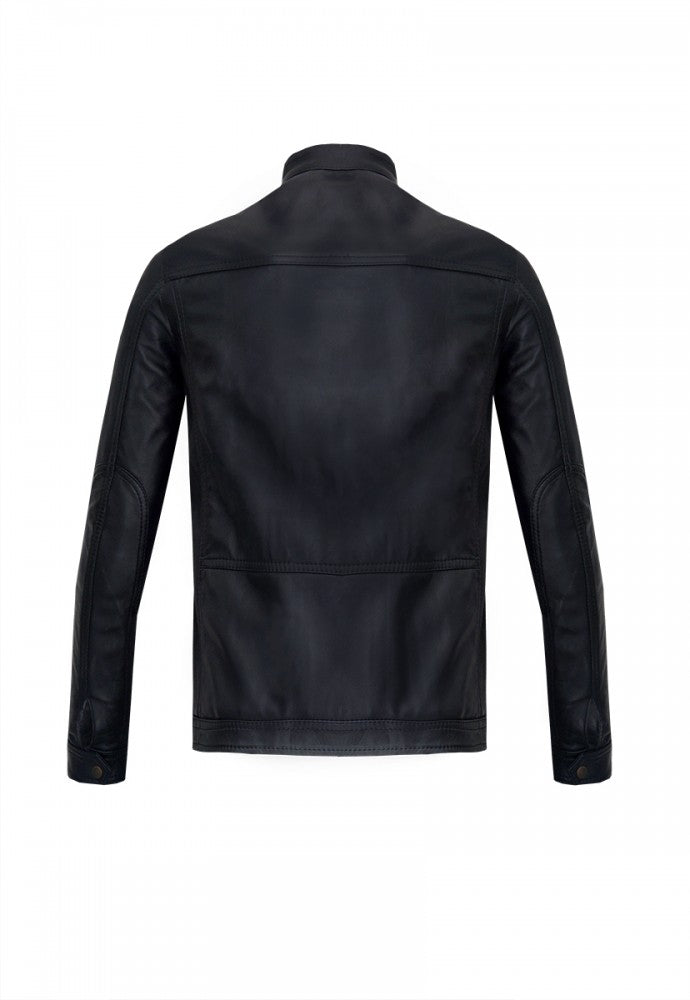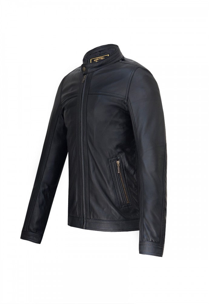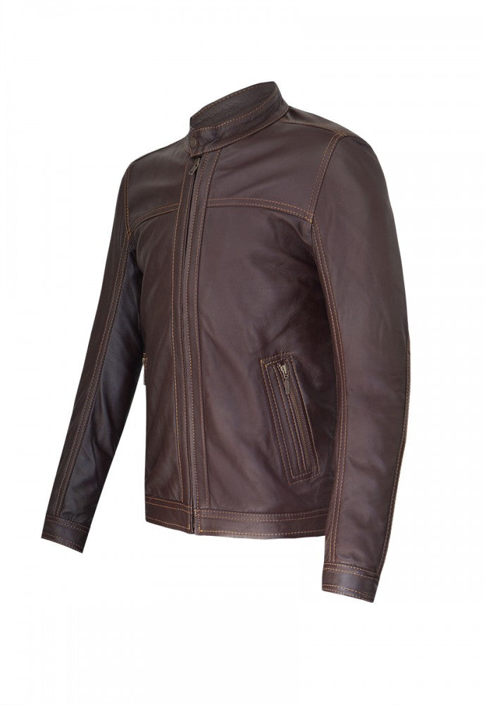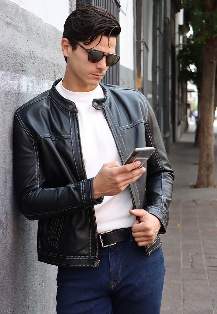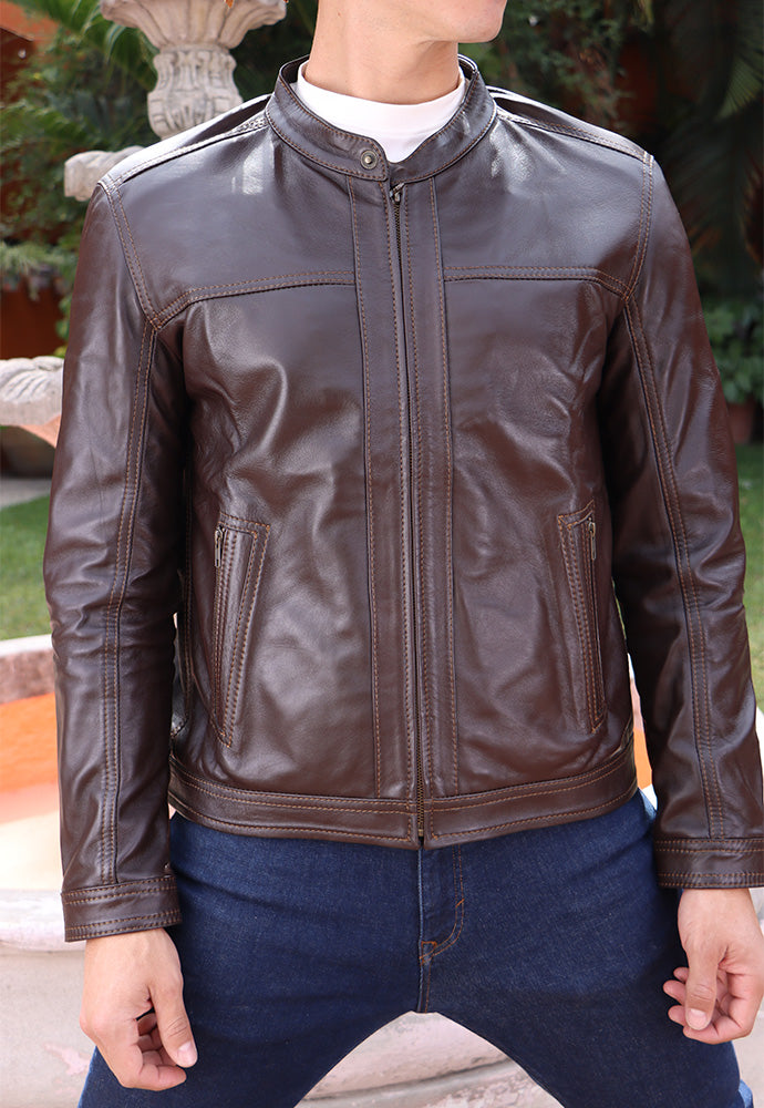 Chamarra de caballero de piel genuina de borrego con forro textil tipo satín, cierre metálico color latón viejo con broche de presión en el cuello tipo Mao, dos bolsas exteriores y una bolsa interior, disponible en color café y negro con costuras en contraste dorado y negro, tallas desde S hasta XL.