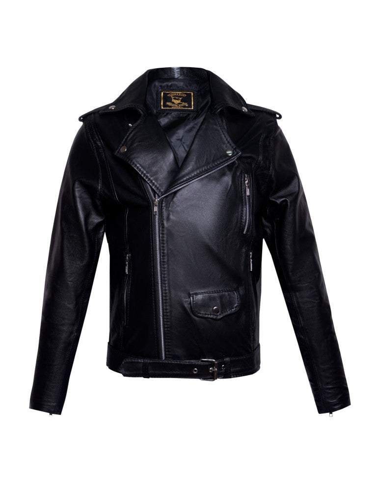 Long leather jacket, rocker style, made of genuine lamb leather, satín-type textile lining and silver-tone metal closure. It has three exterior zipper pouches, one with a metal snap and a collar with metal snaps. Includes silver closures in the sleeve area and a belt with buckle. Available in black, sizes from XS to L.