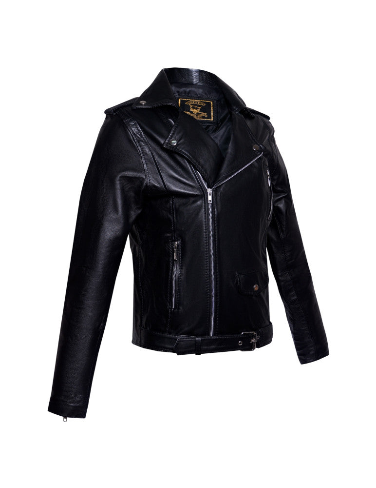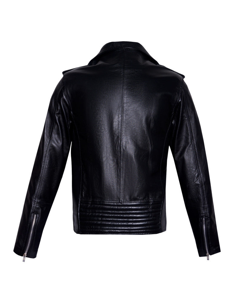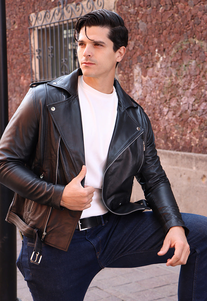 Chamarra larga de piel, estilo rockero, fabricada en cuero genuino de borrego, forro textil tipo satín y cierre metálico en tono plata. Cuenta con tres bolsas exteriores en cierre, una con broche de presión metálico y cuello con broches de presión metálico. Incluye cierres color plata en la zona de las mangas y un cinturón con hebilla. Disponible en tono negro, tallas desde XS hasta L.
