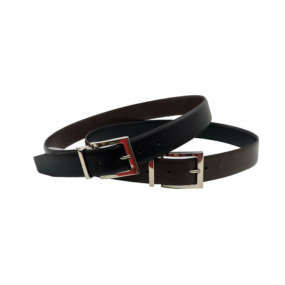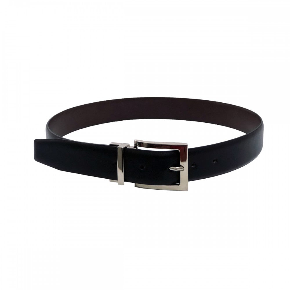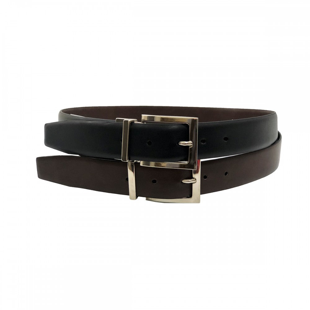 Double-sided leather belt, wide, smooth leather in black with brown, reversible nickel-color buckle. Available in sizes from 30 to 50.