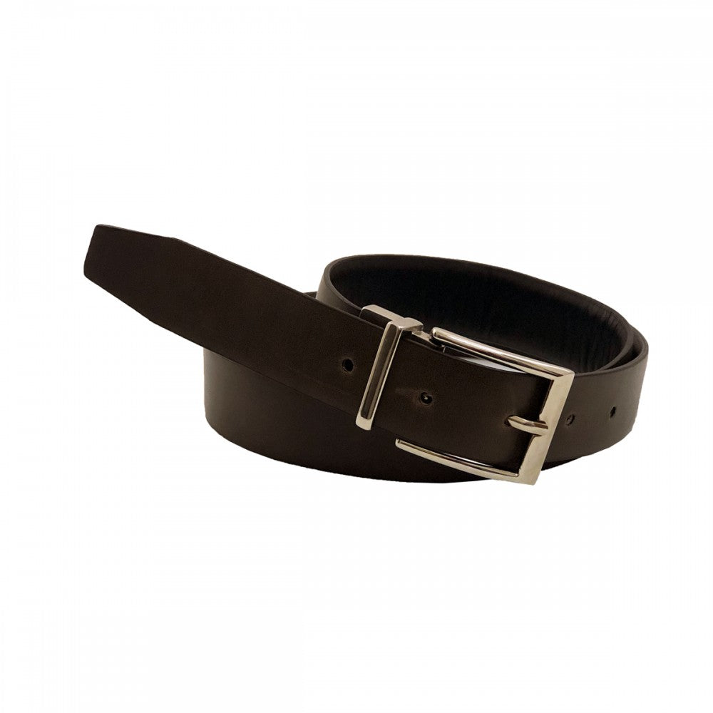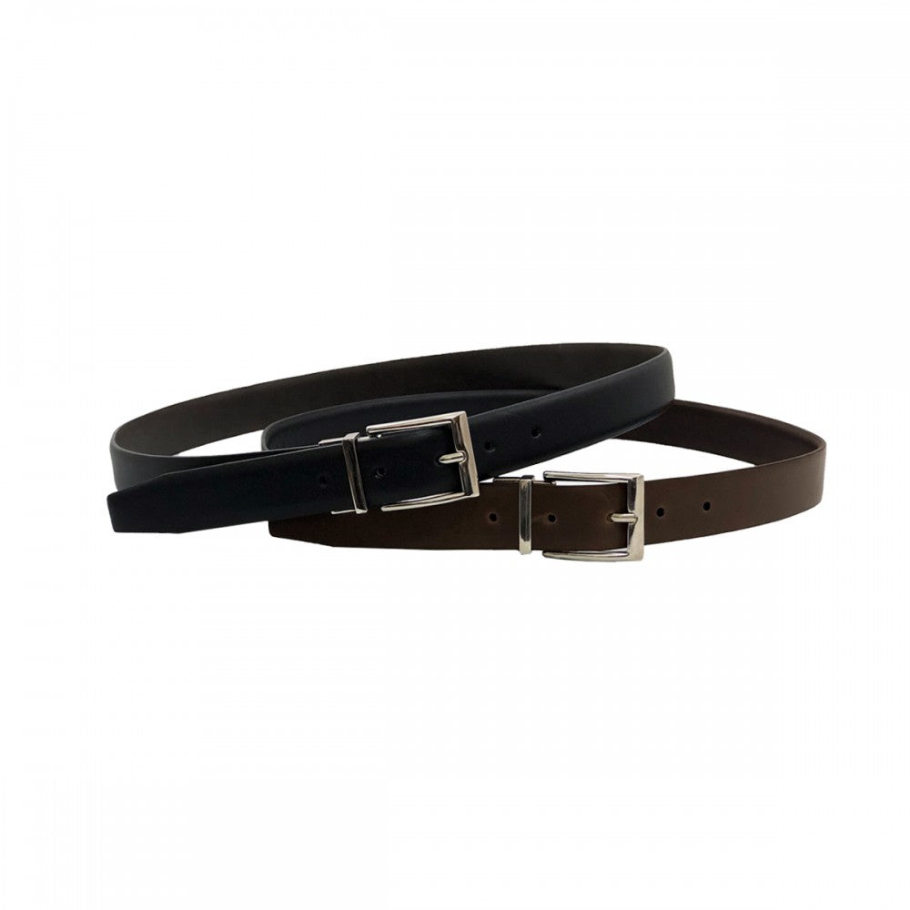 Slim double-sided leather belt, smooth leather belt with reversible nickel-color buckle. Available in black with brown, sizes from 30 to 42.