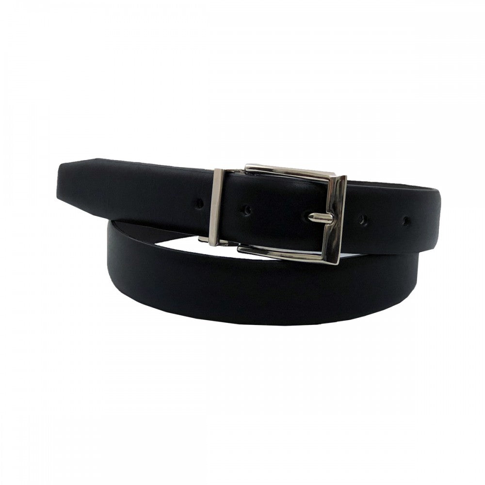 Cinturón de piel doble vista delgado cinto de cuero liso con hebilla reversible color níquel. Disponible en color negro con café, tallas desde 30 a 42.