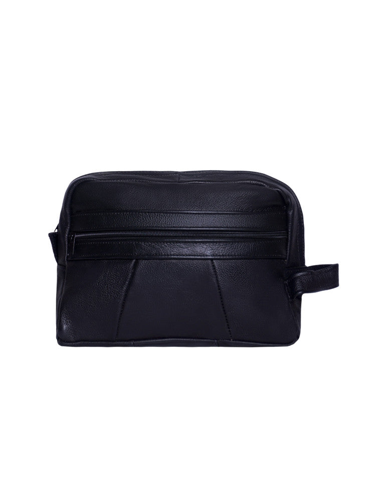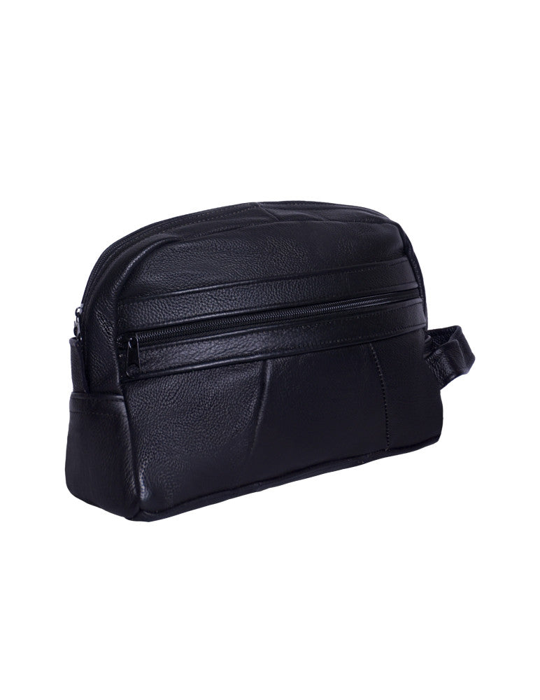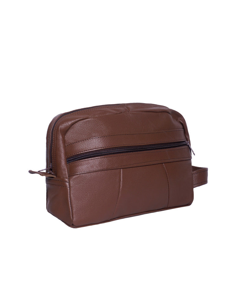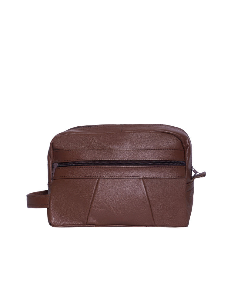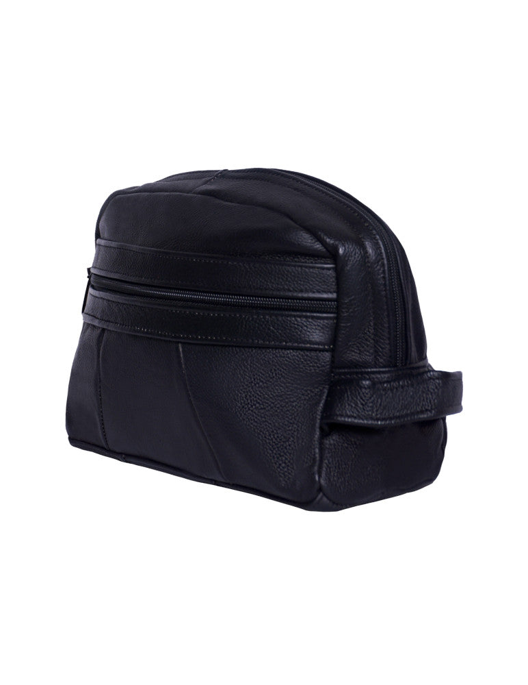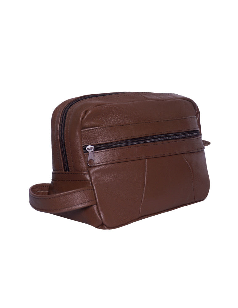 Classic style cowhide toiletry bag. Travel bag made of the best quality leather, it has two zippered pockets on the outside and a handle. It has a pocket on the inside.
