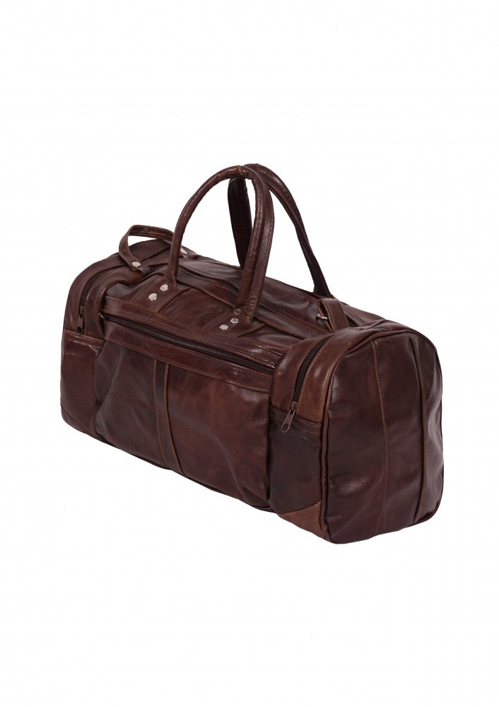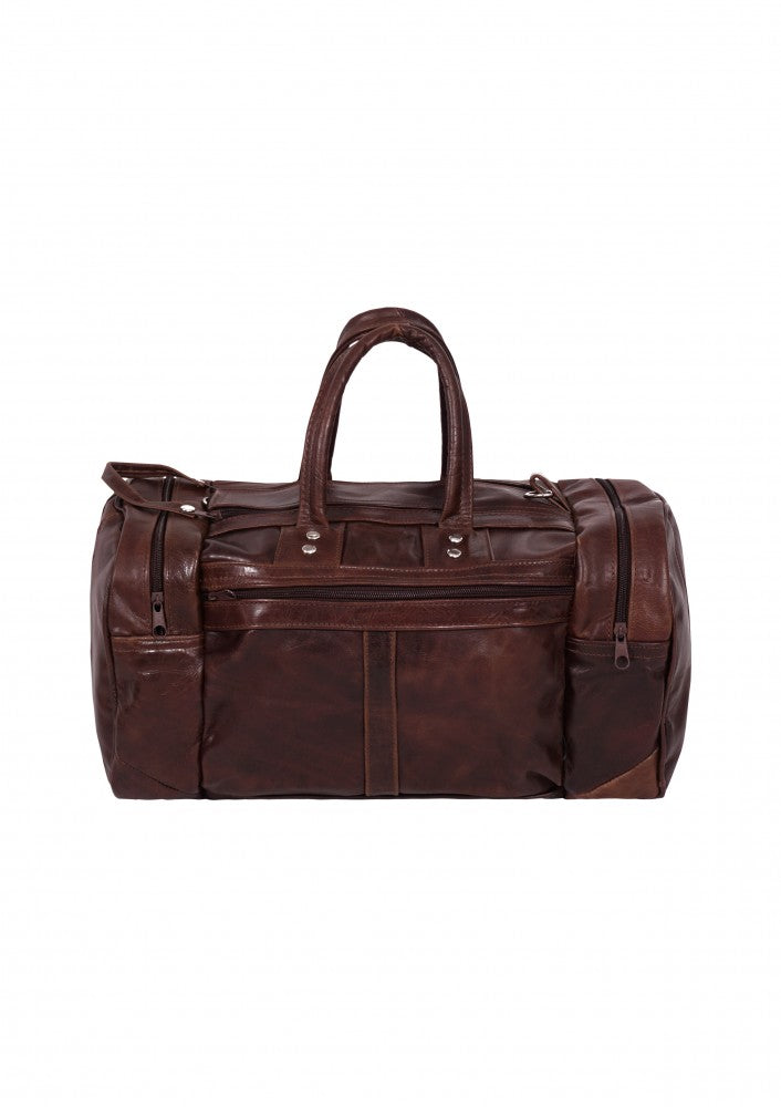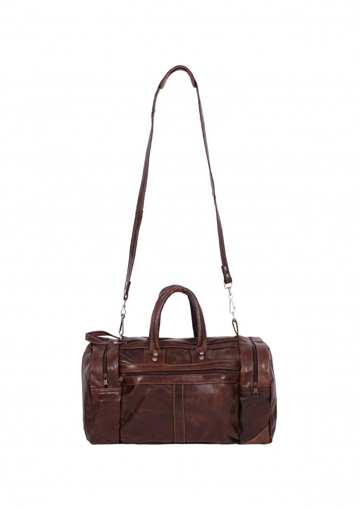 Maleta fabricada en piel de vacuno genuina con dos bolsas laterales y un compartimento en cierre en la parte frontal, cuenta con correa de mano y un strap largo para poder utilizar como bolso, ideal para llevar como equipaje de mano.