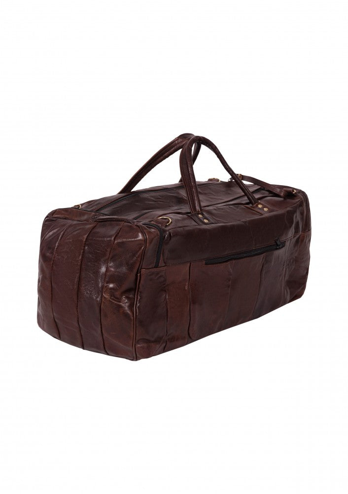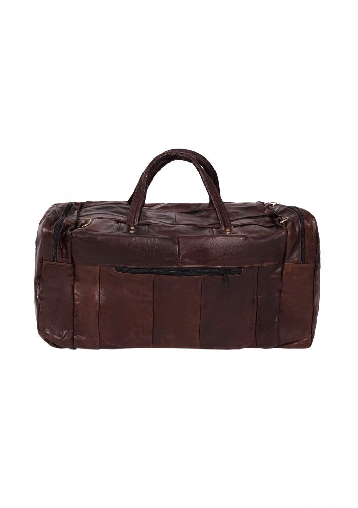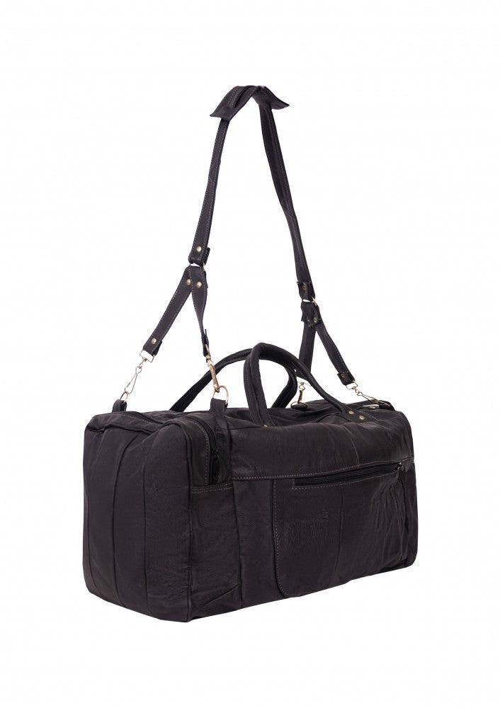 Maleta fabricada en piel de vacuno genuina con dos bolsas laterales y un compartimento en cierre en la parte frontal, cuenta con correa de mano y un strap largo para poder utilizar como bolso.