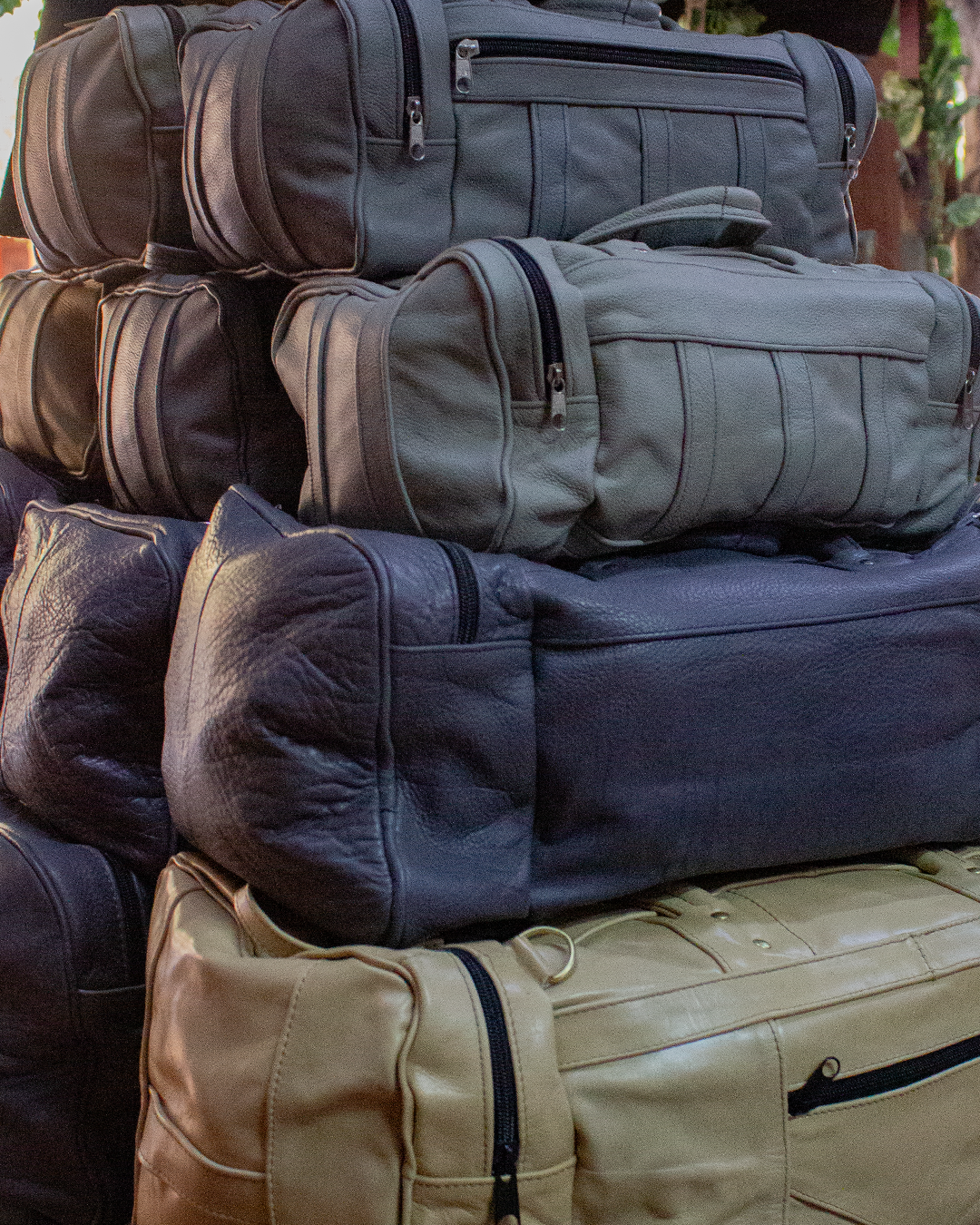 Suitcase made of genuine vacuum leather with two side bags and a zippered compartment on the front, it has a hand strap and a long strap to be used as a bag.