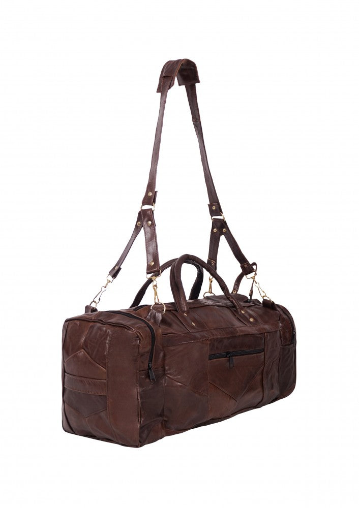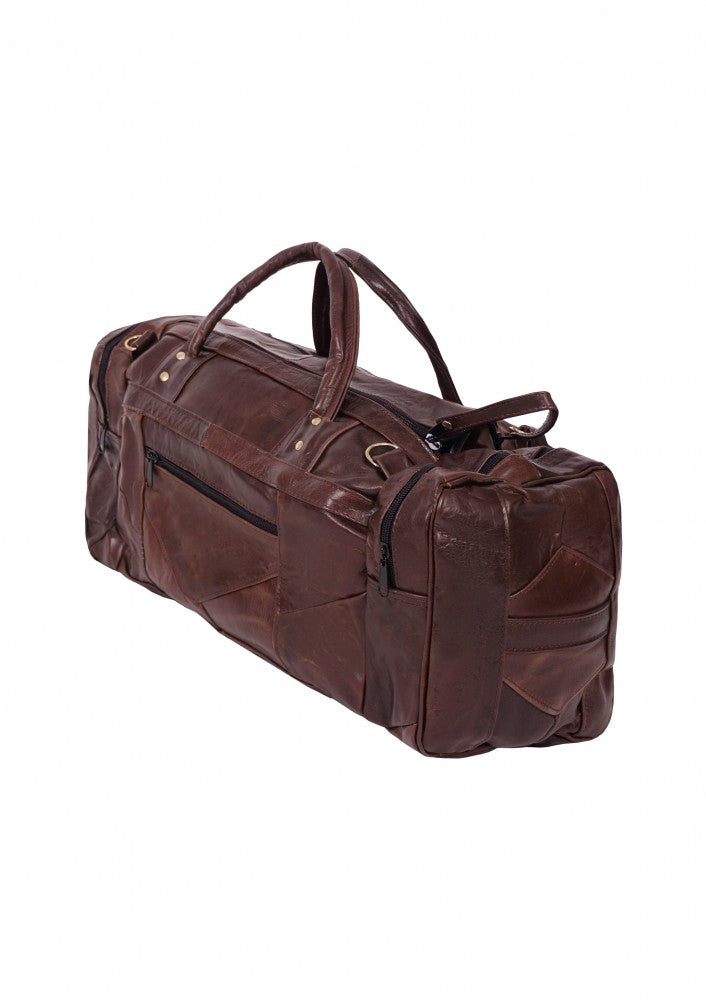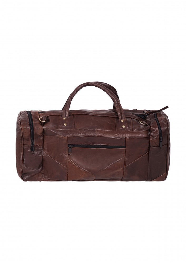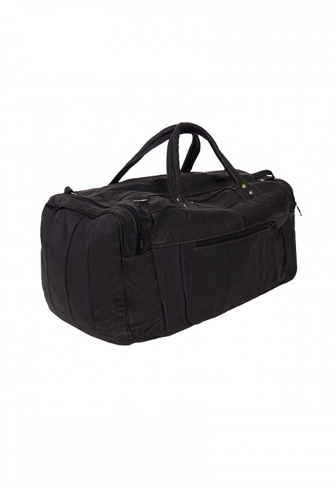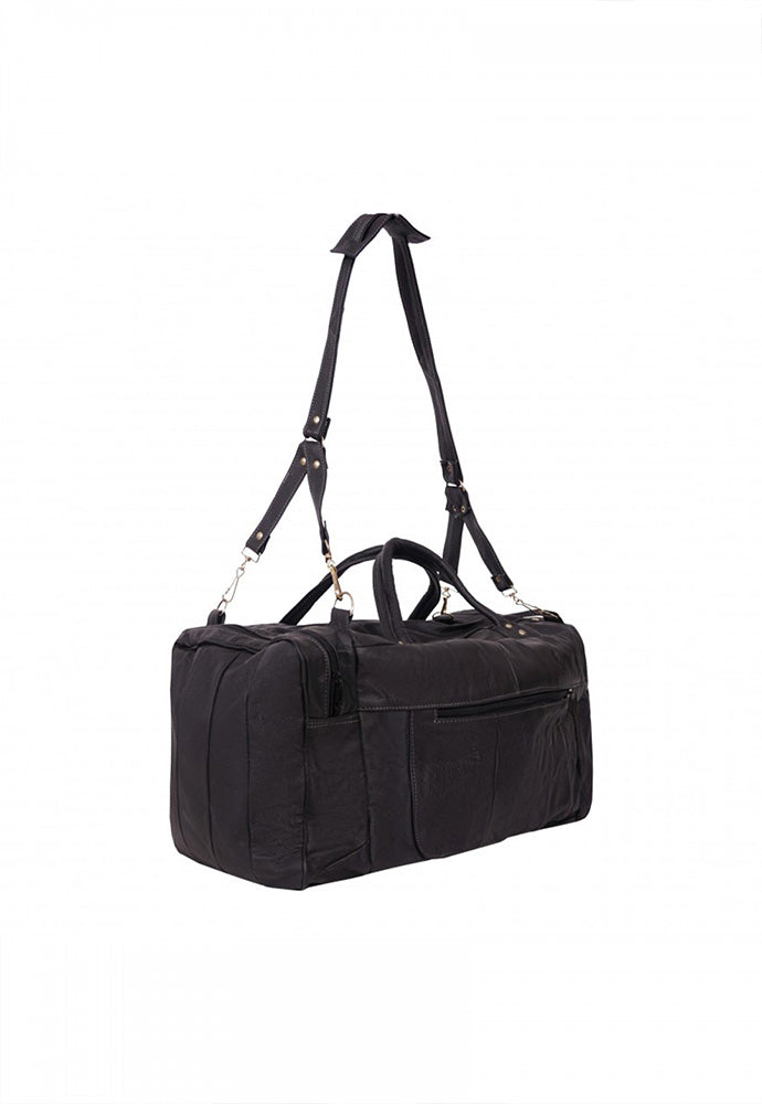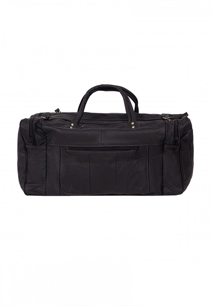 Maleta fabricada en piel de vacuno genuina con dos bolsas laterales y un compartimento en cierre en la parte frontal, cuenta con correa de mano y un strap largo para poder utilizar como bolso, ideal para llevar como equipaje de mano.