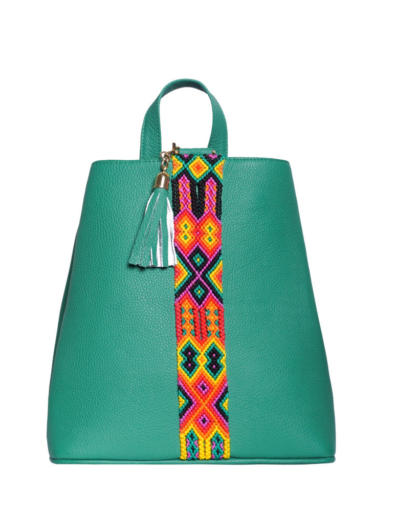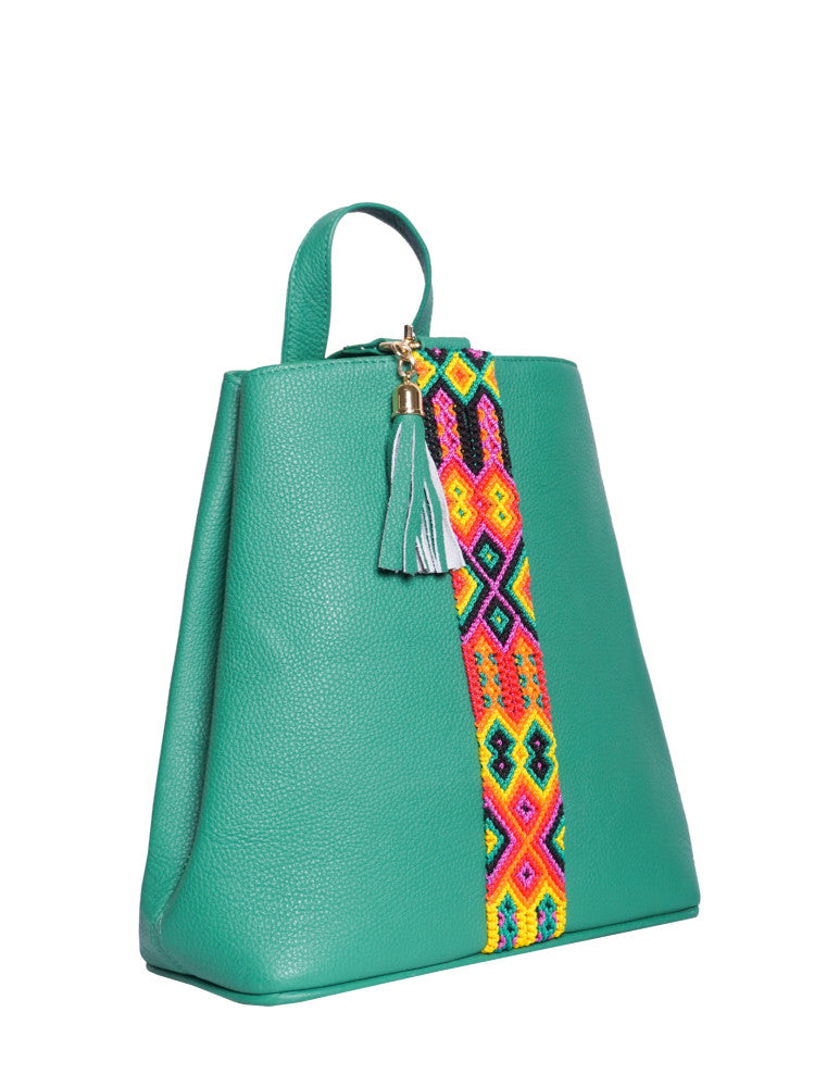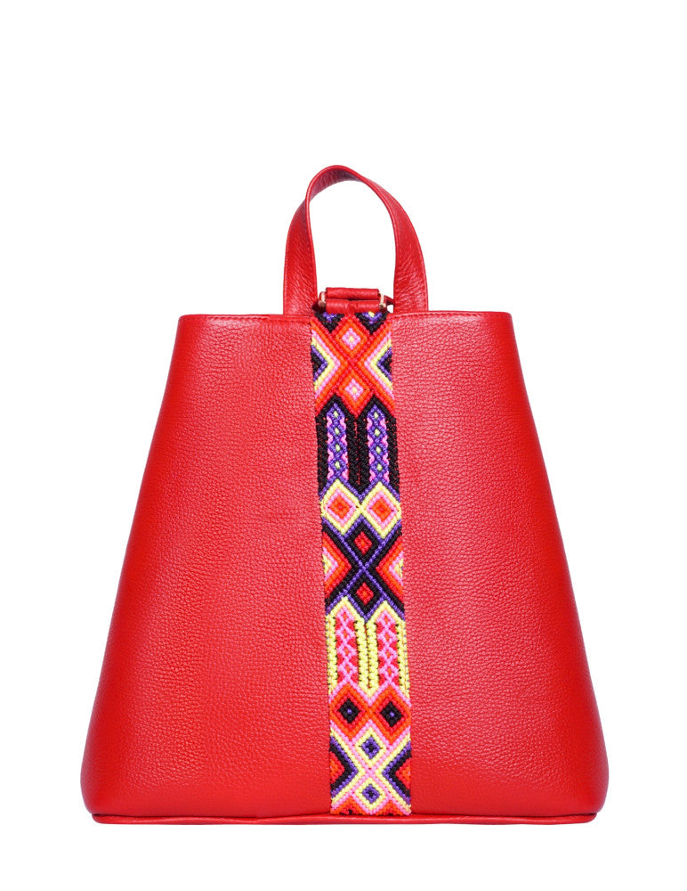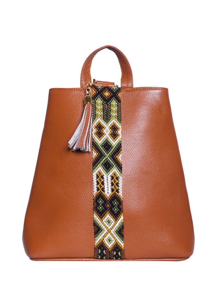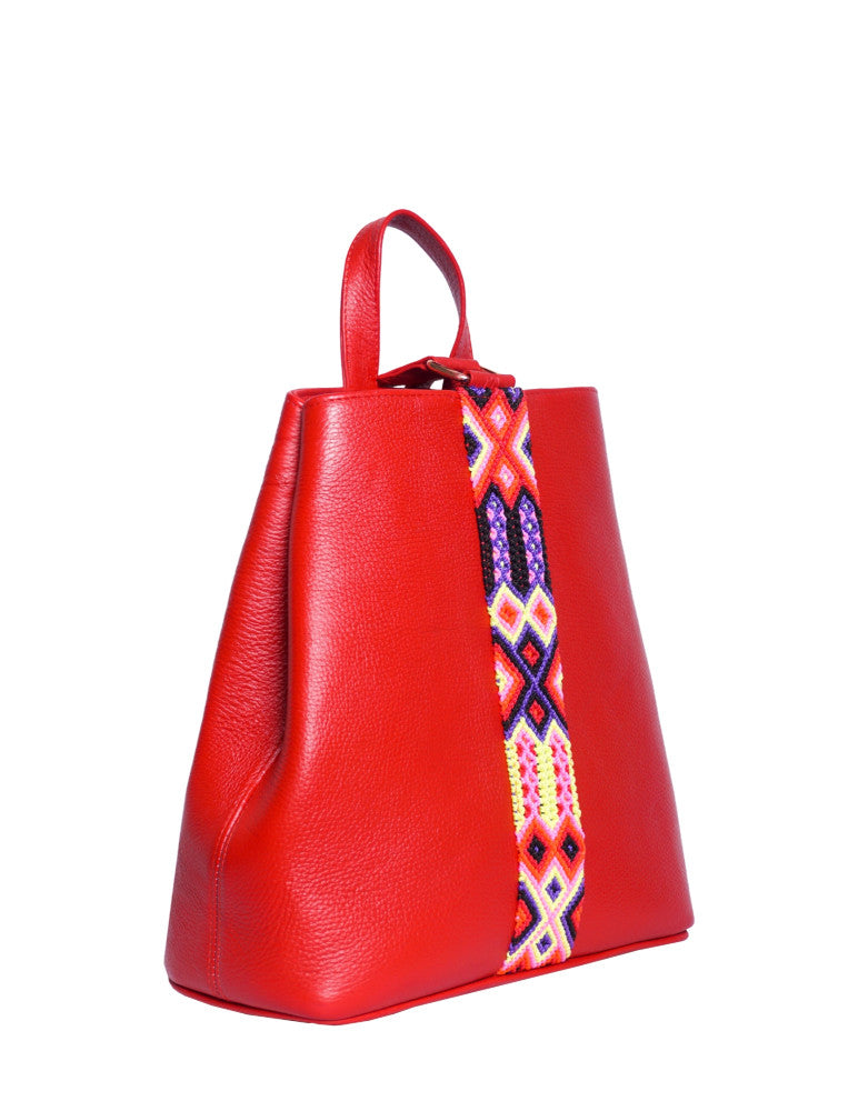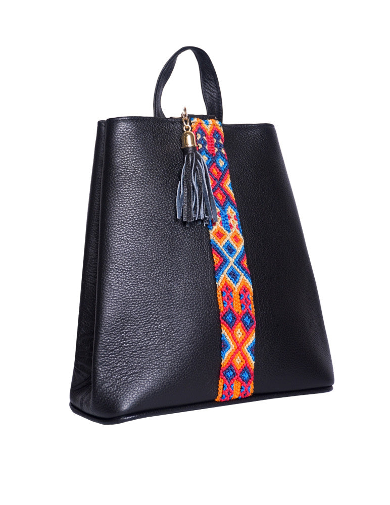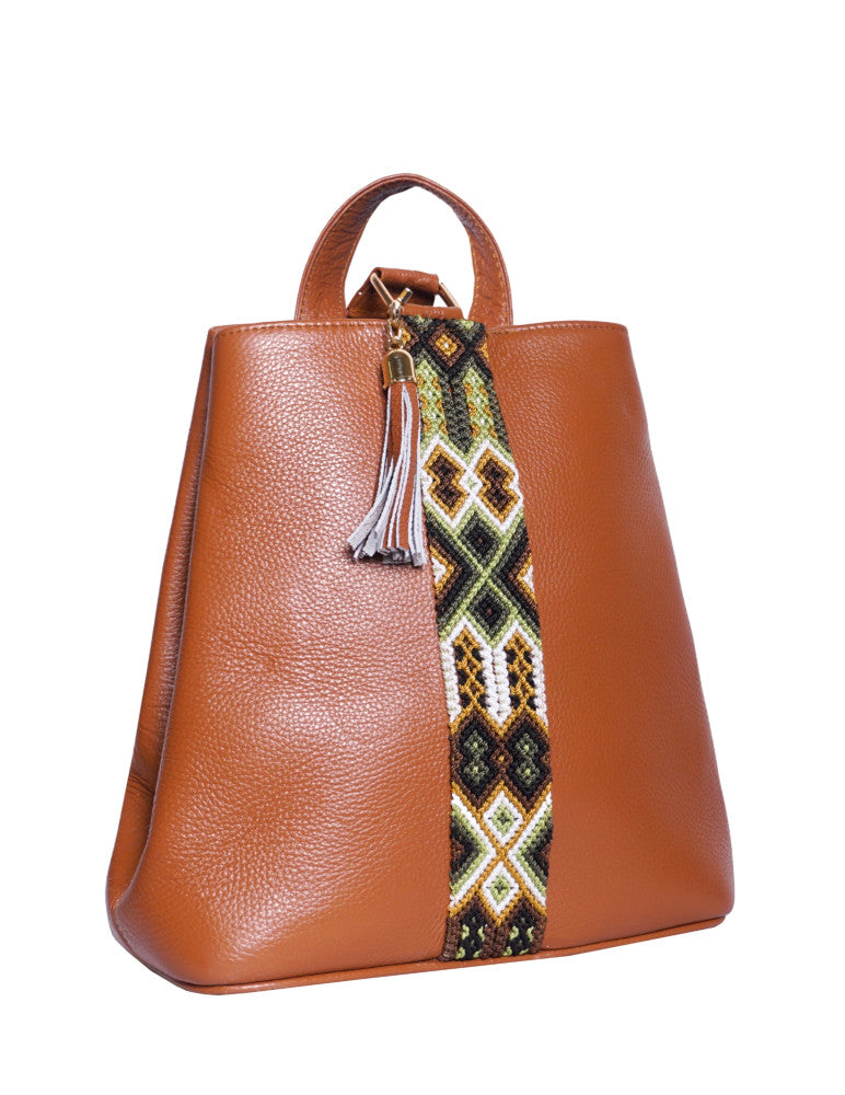Bolsa tipo mochila de piel, adornada con el fino arte de Chiapas, ideal para el uso diario. Cuenta con un bolsillo interior con cremallera y gancho interior, además de un compartimiento. Cierra por medio de broche. y está fabricada con cuero de la más alta calidad.