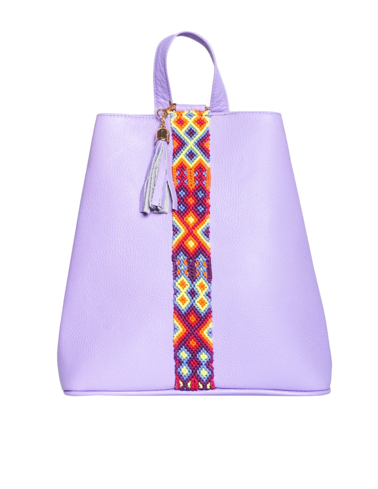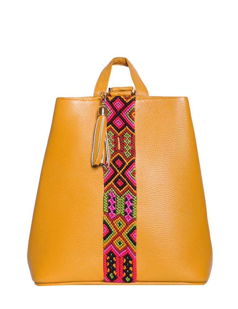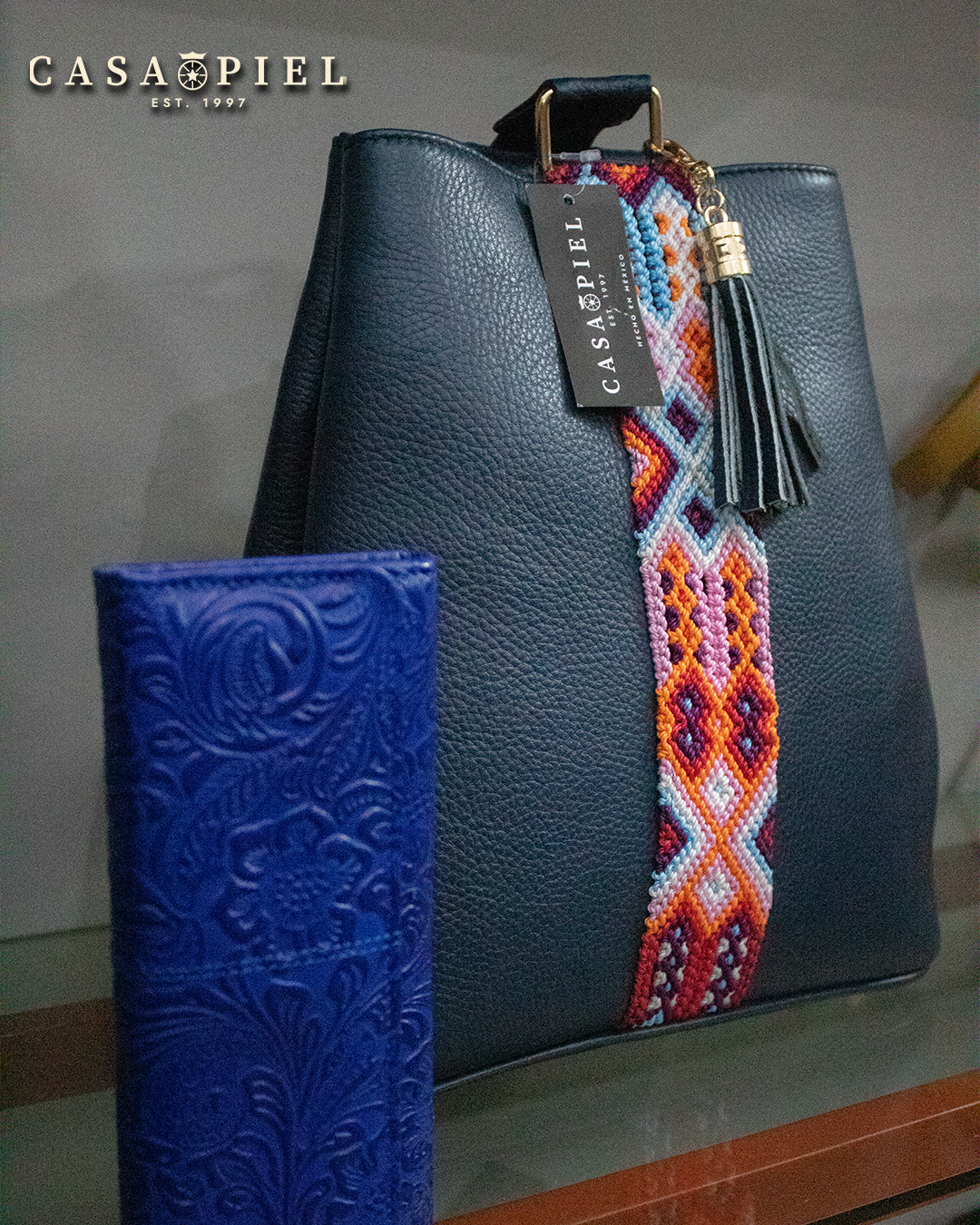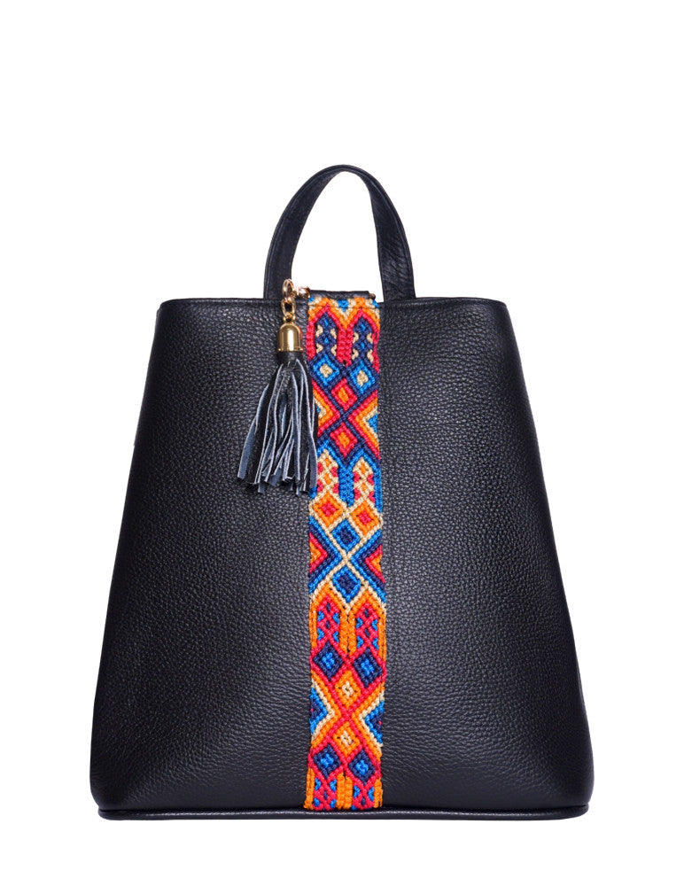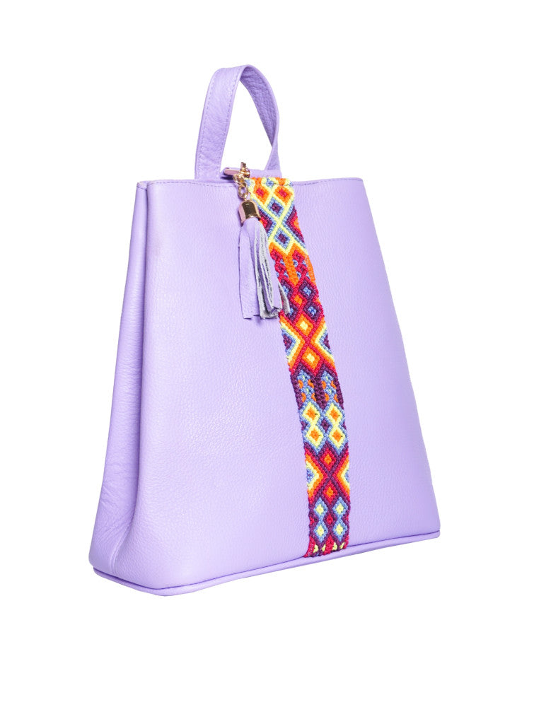 Bolsa tipo mochila de piel, adornada con el fino arte de Chiapas, ideal para el uso diario. Cuenta con un bolsillo interior con cremallera y gancho interior, además de un compartimiento. Cierra por medio de broche. y está fabricada con cuero de la más alta calidad.