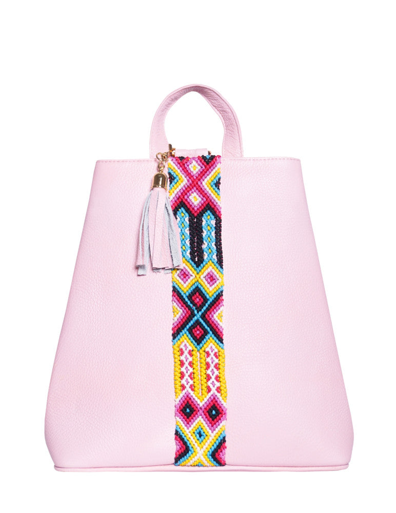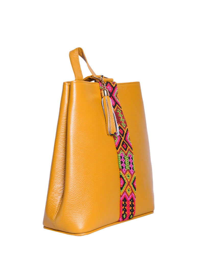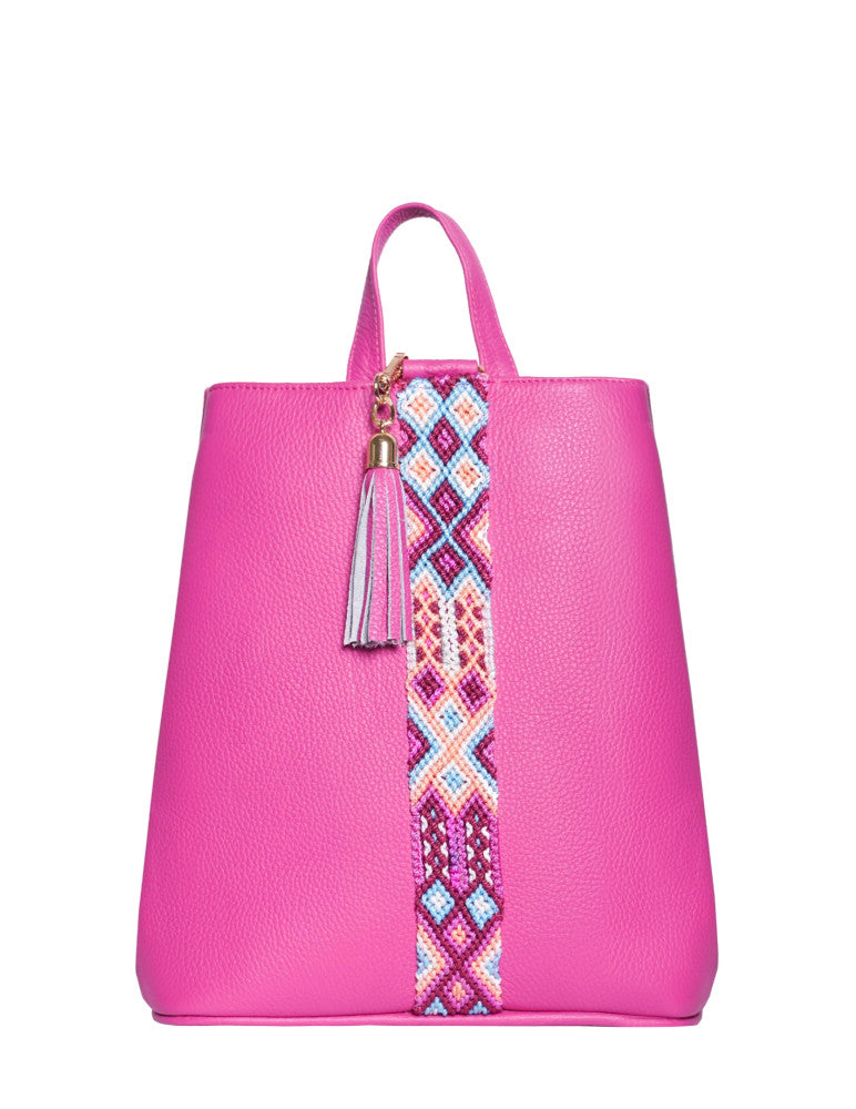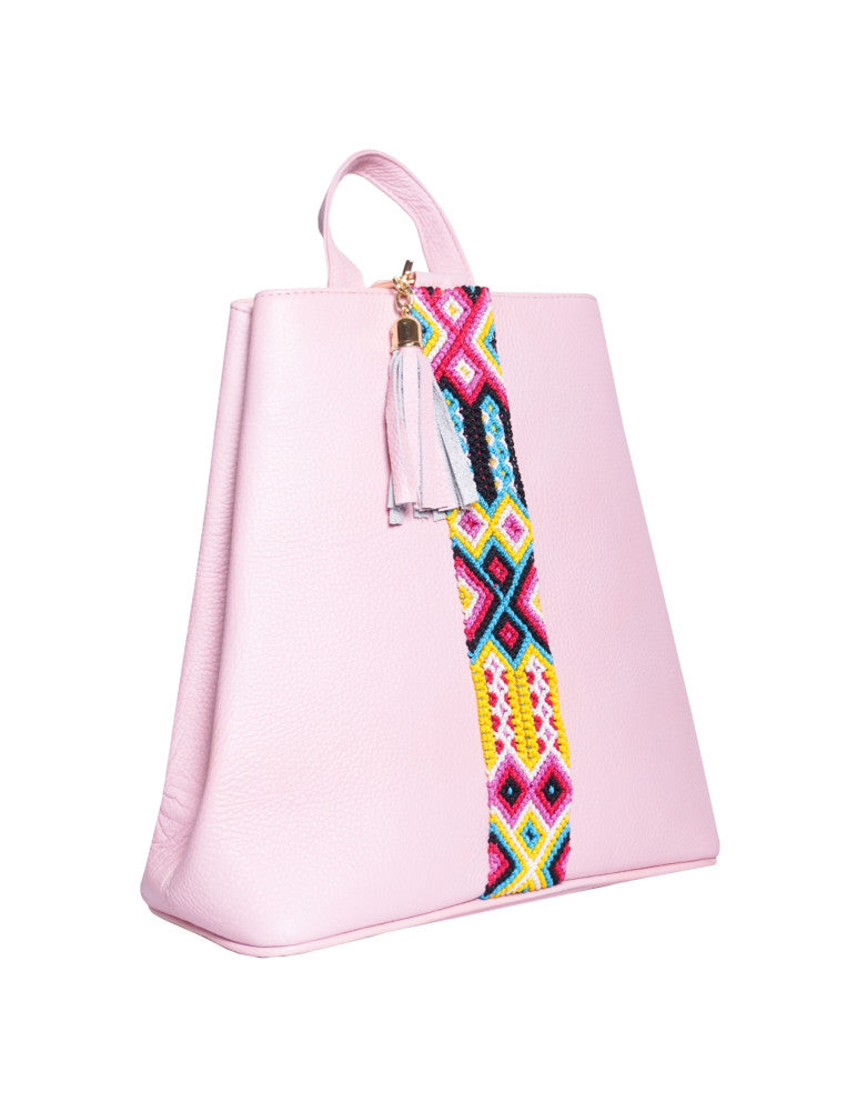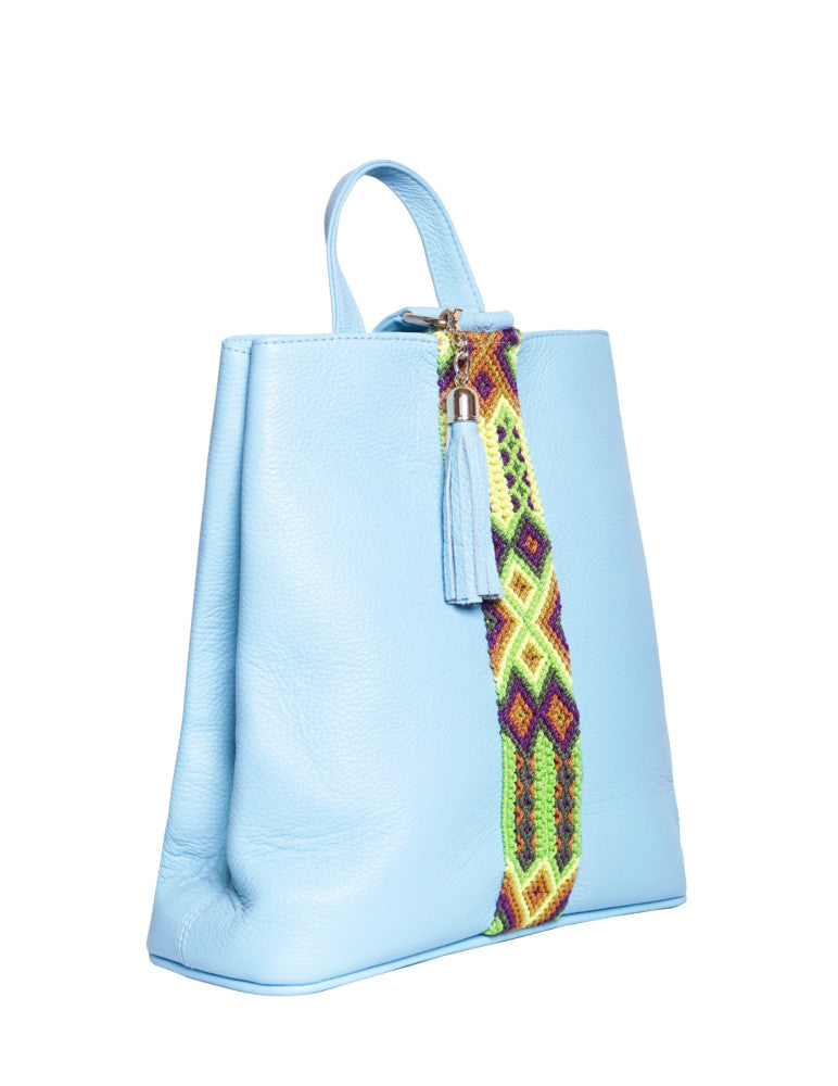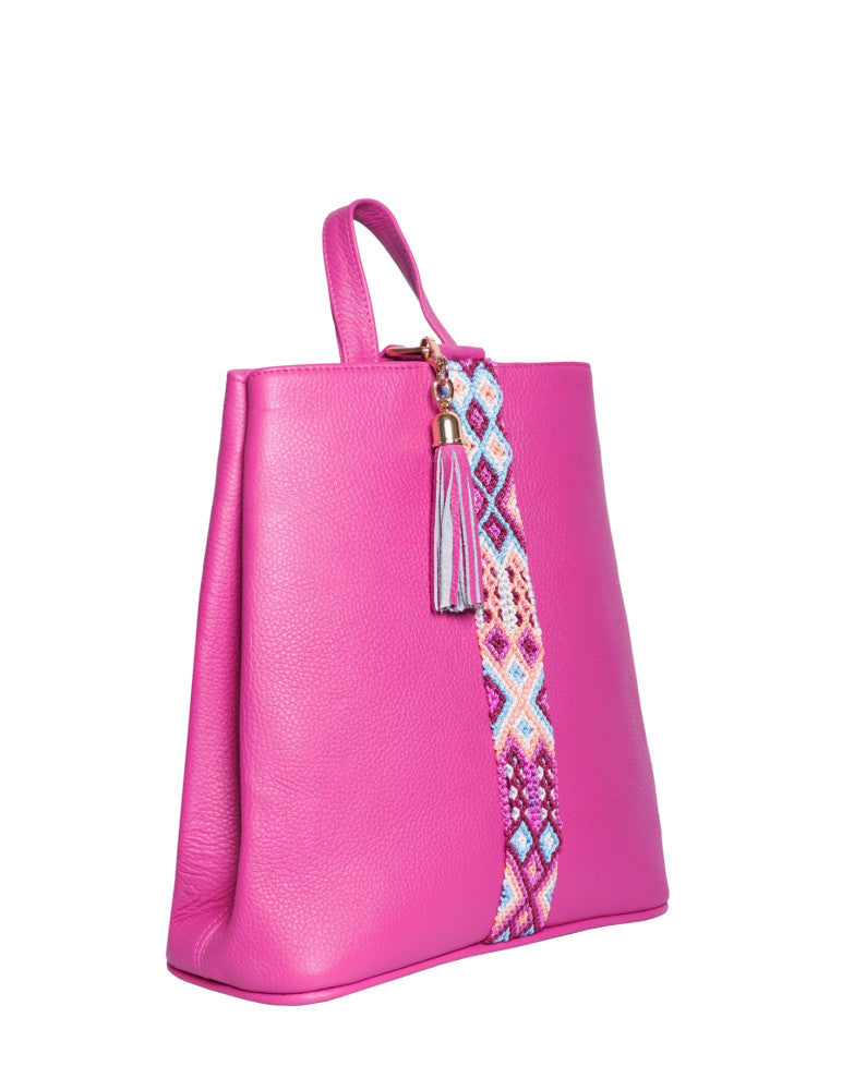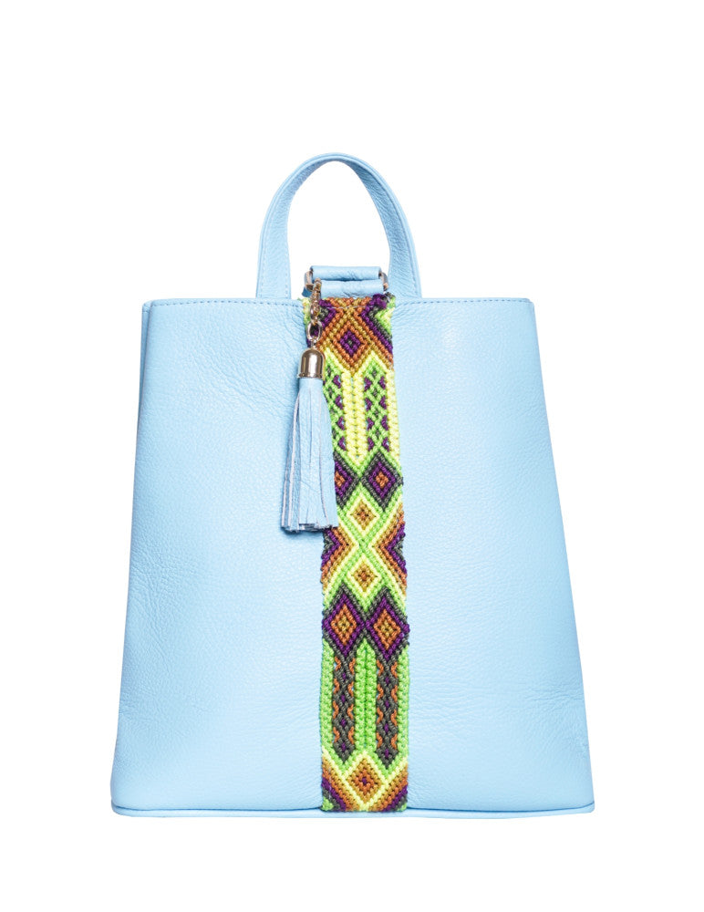 Bolsa tipo mochila de piel, adornada con el fino arte de Chiapas, ideal para el uso diario. Cuenta con un bolsillo interior con cremallera y gancho interior, además de un compartimiento. Cierra por medio de broche. y está fabricada con cuero de la más alta calidad.