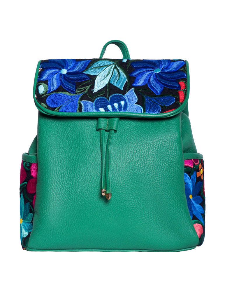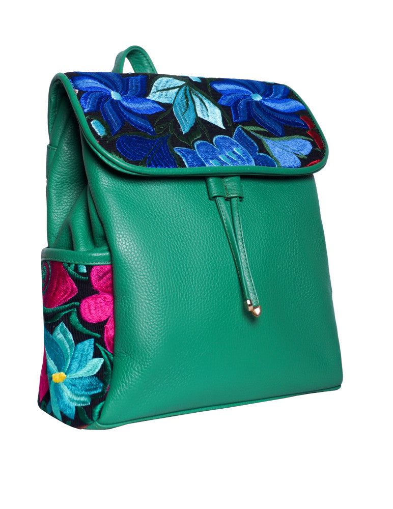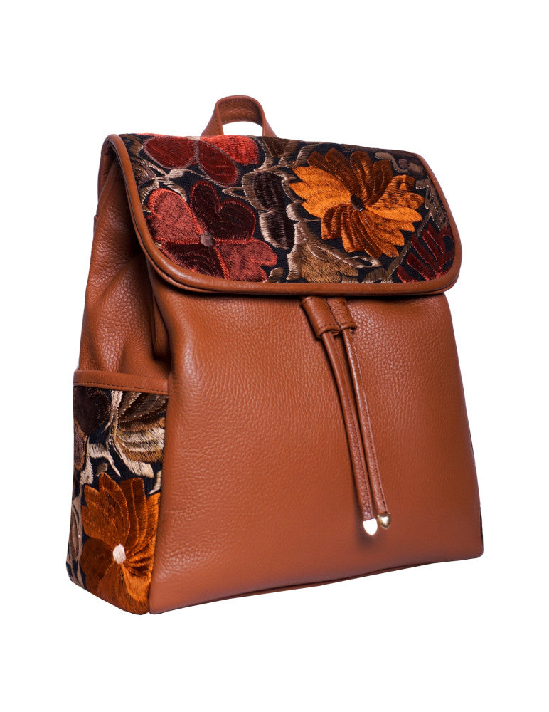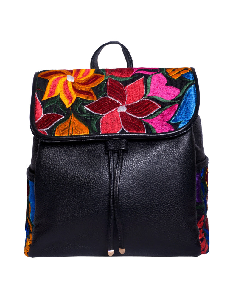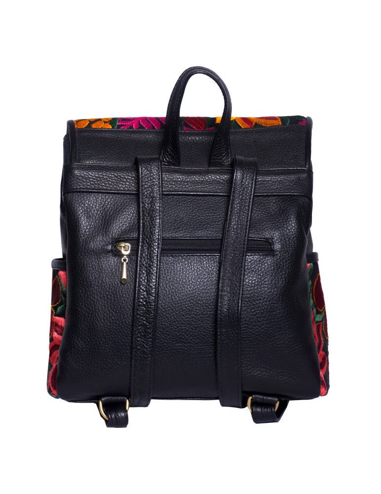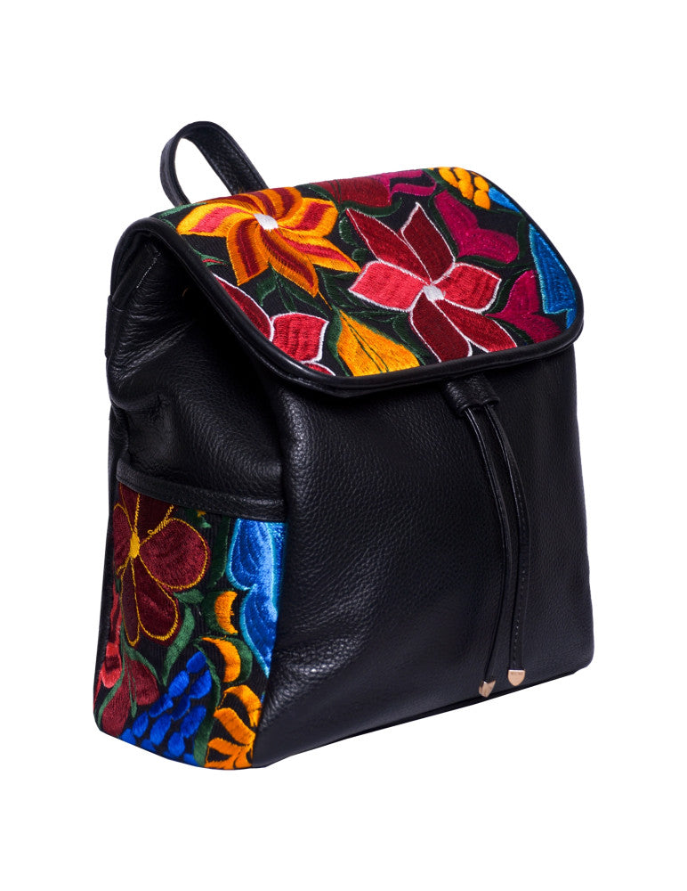 Backpack type bag, leather backpack, decorated on the lid and side pockets with the fine embroidered art of Chiapas, Mexico. It has an interior pocket with zipper, interior hook and closes with a strap.