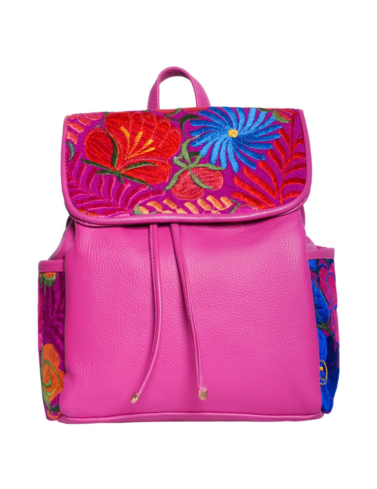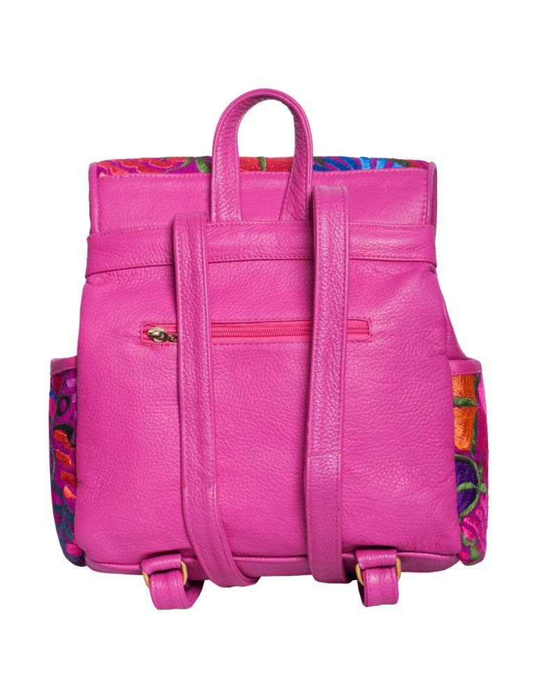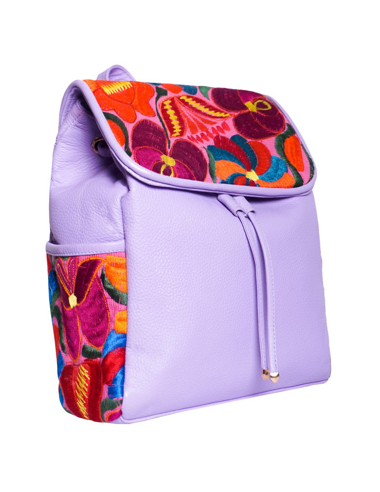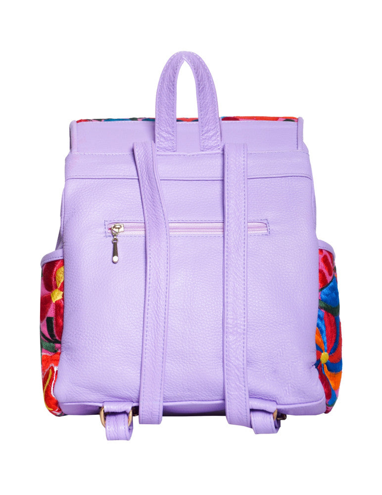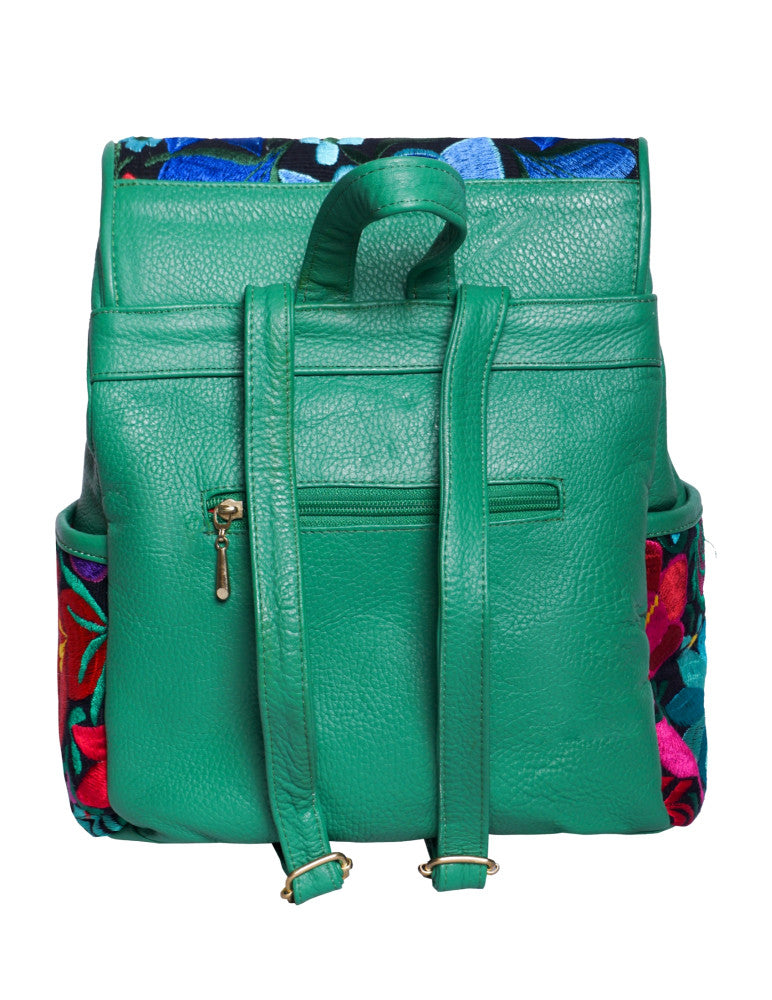 Backpack type bag, leather backpack, decorated on the lid and side pockets with the fine embroidered art of Chiapas, Mexico. It has an interior pocket with zipper, interior hook and closes with a strap.