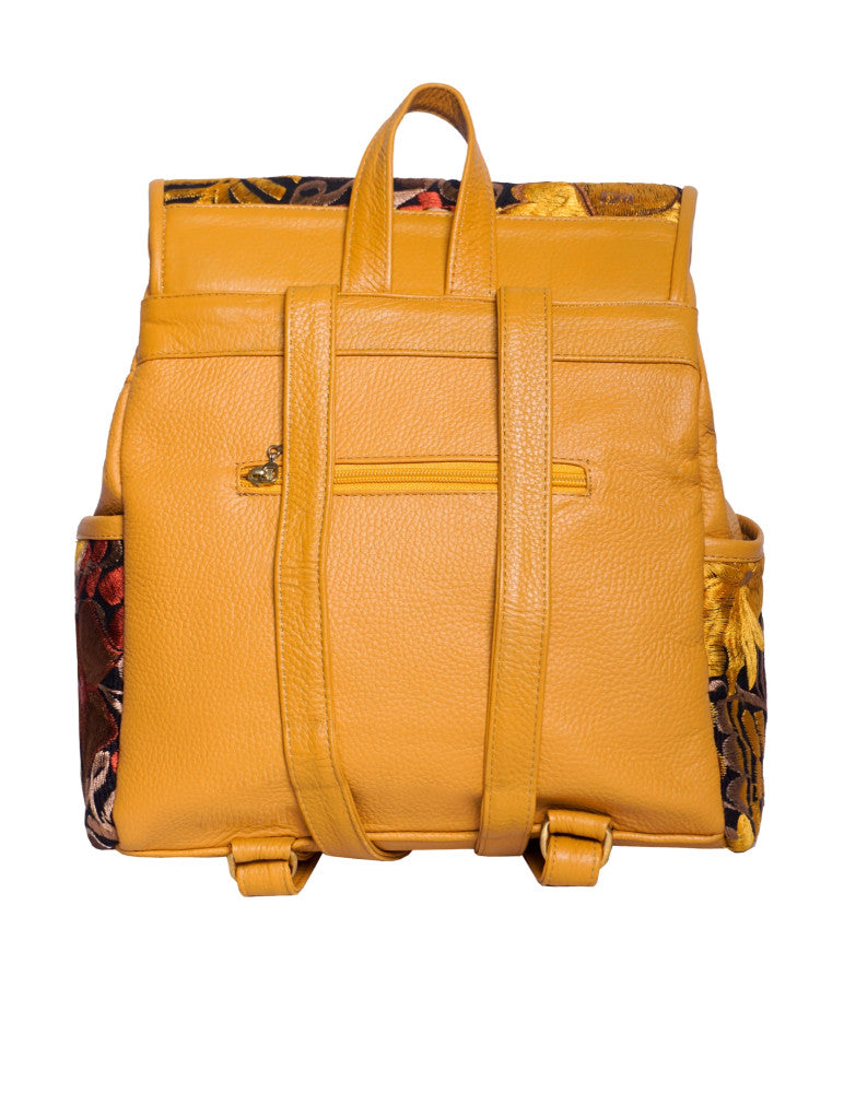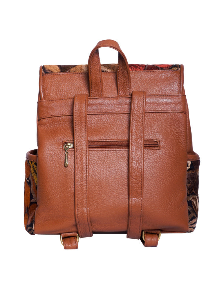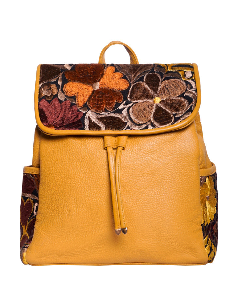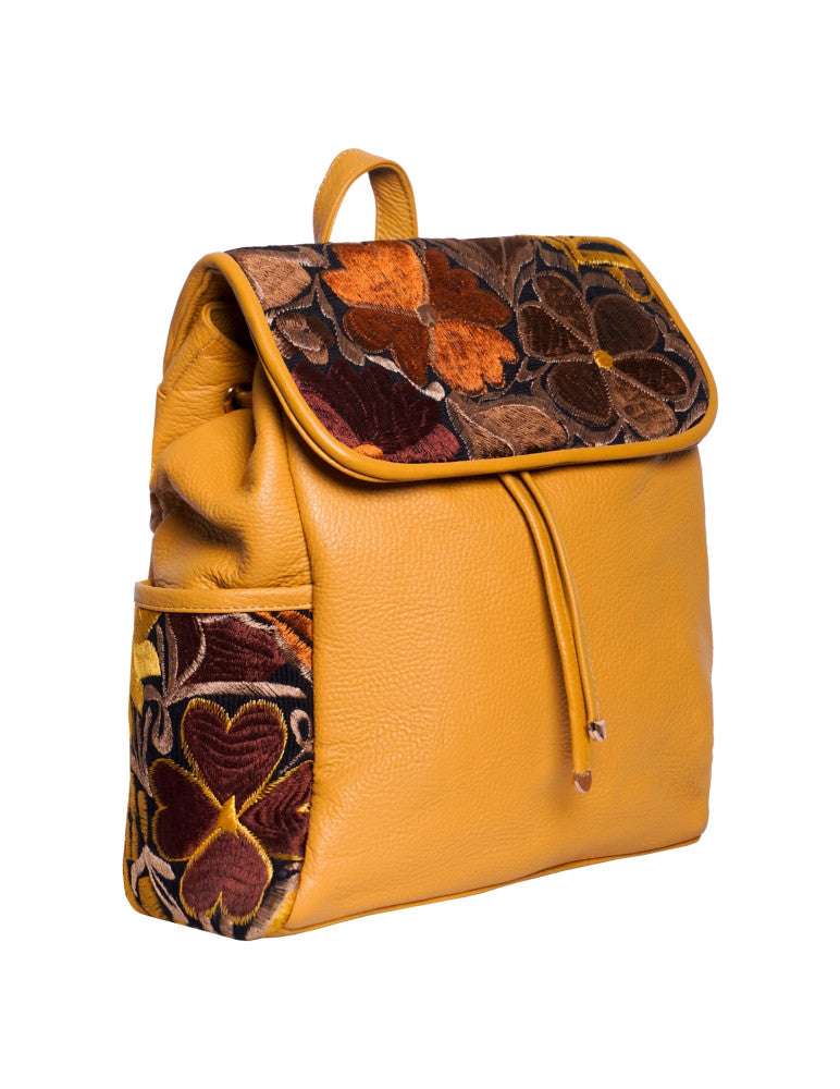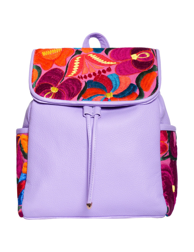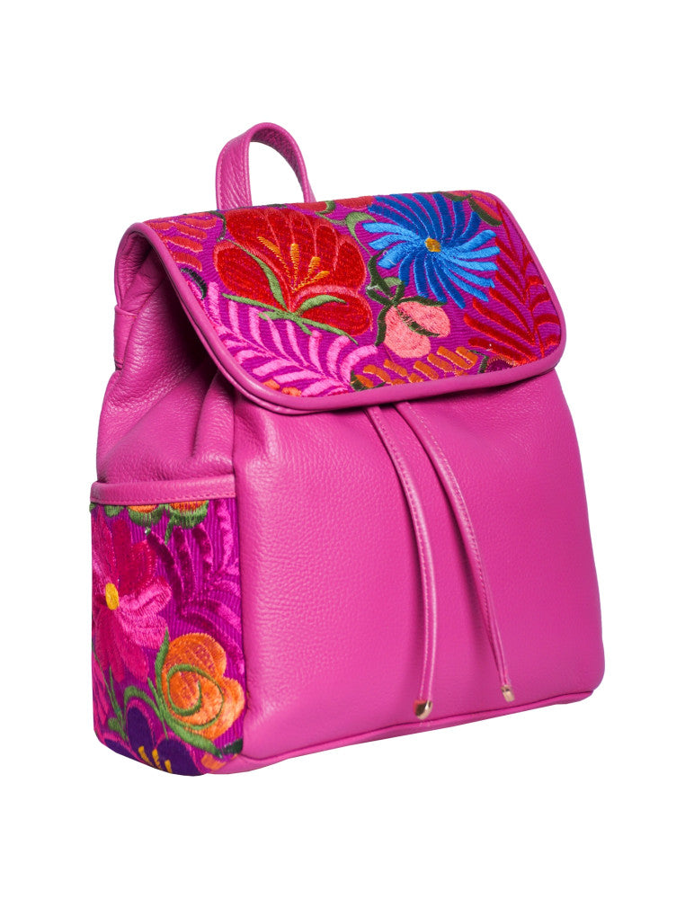 Backpack type bag, leather backpack, decorated on the lid and side pockets with the fine embroidered art of Chiapas, Mexico. It has an interior pocket with zipper, interior hook and closes with a strap.