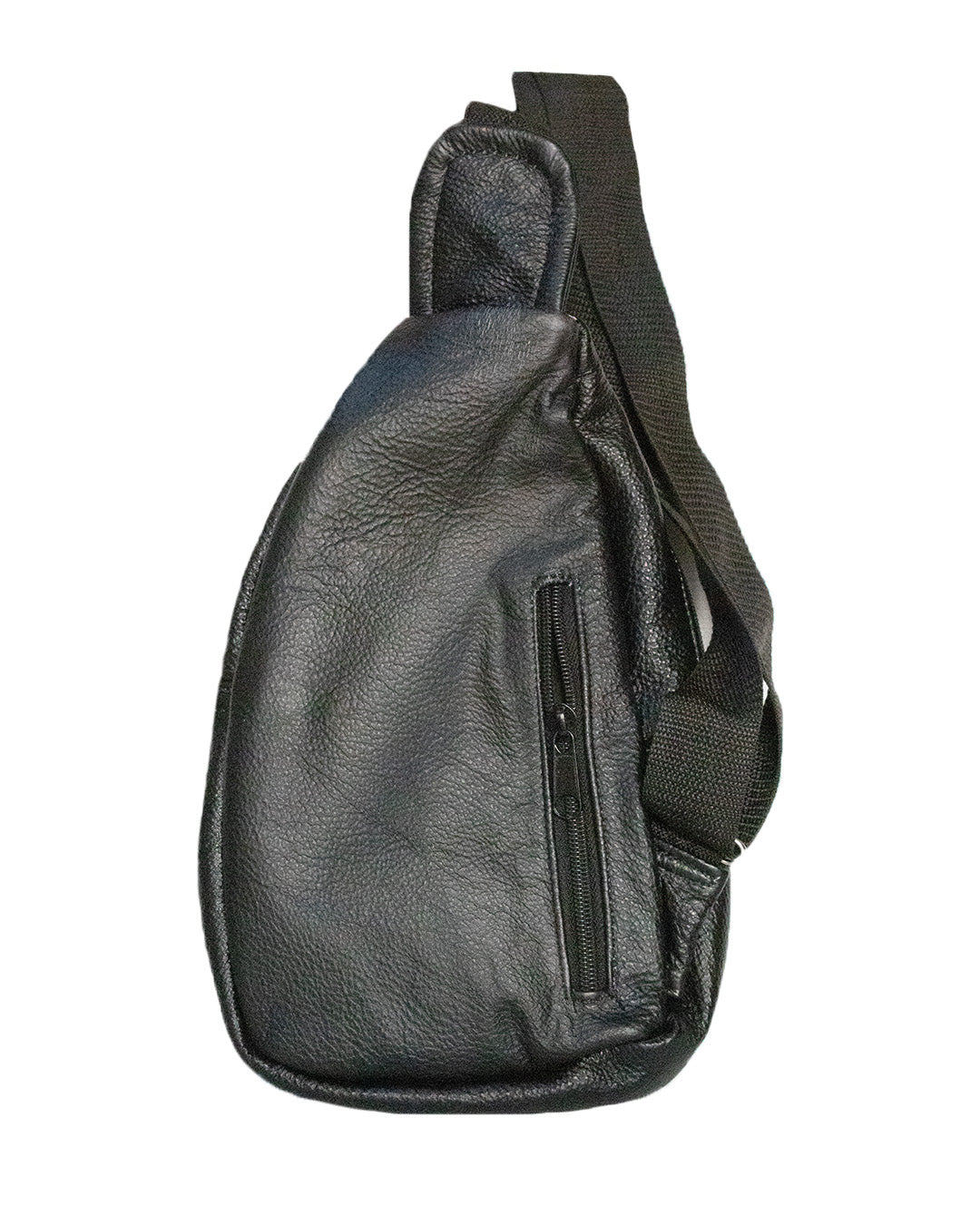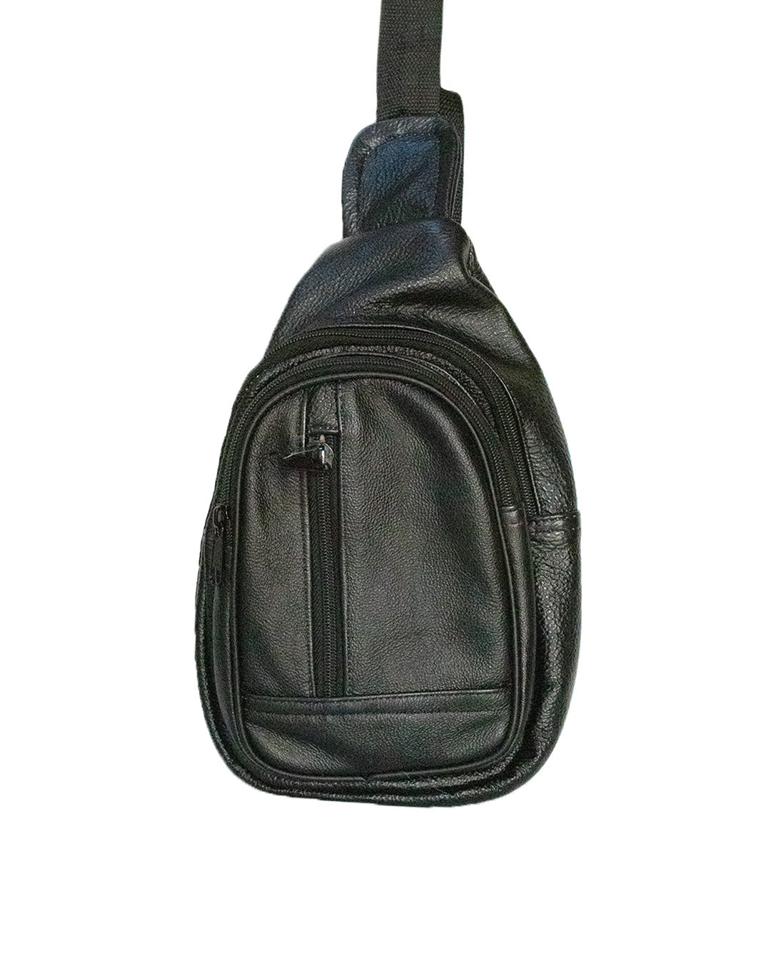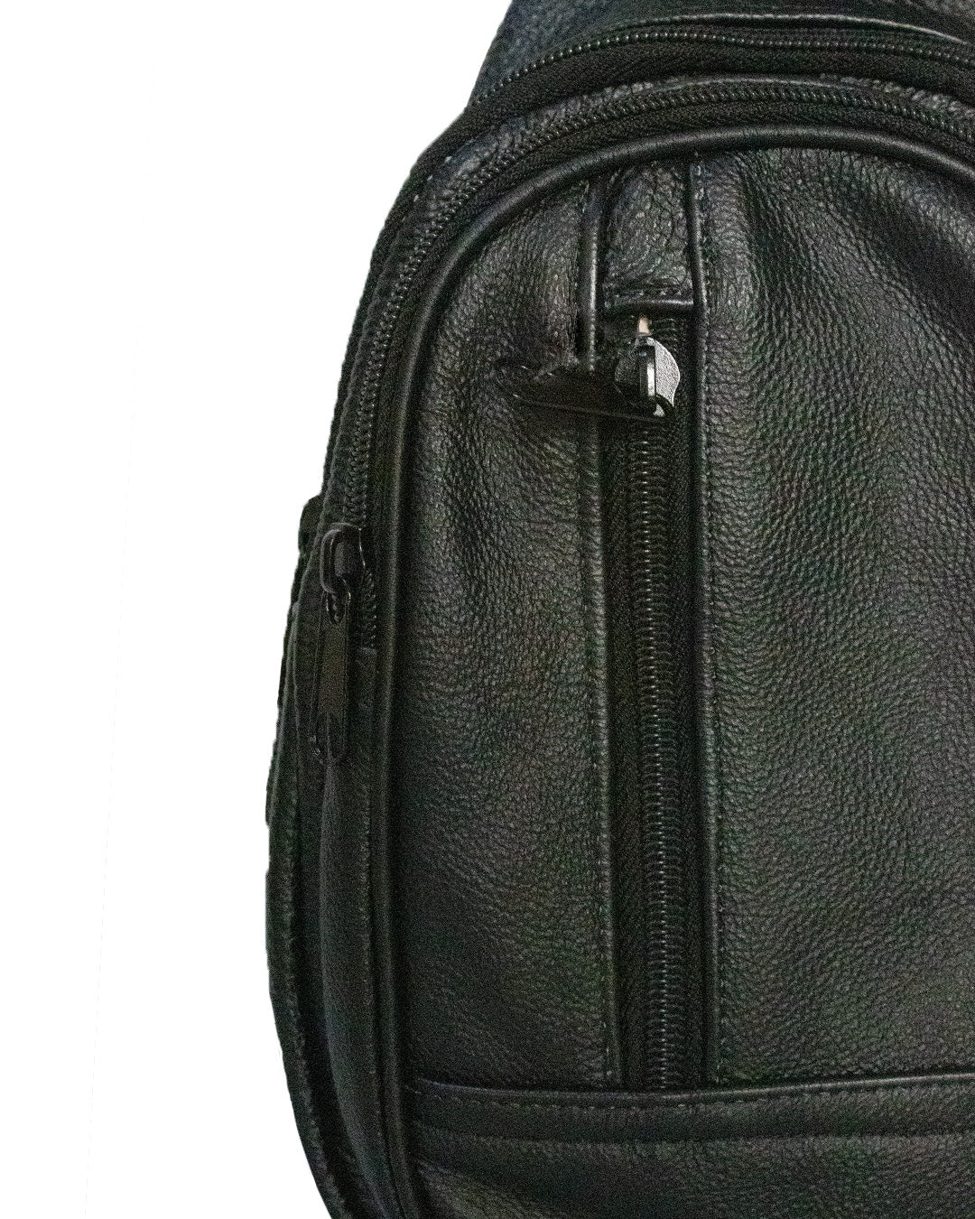 Genuine leather chest bag with two small front pockets, one main pocket with a zipper and one back pocket with a hidden zipper. Its multiple compartments make it ideal for carrying all your daily essentials and small items. It also has an adjustable strap.